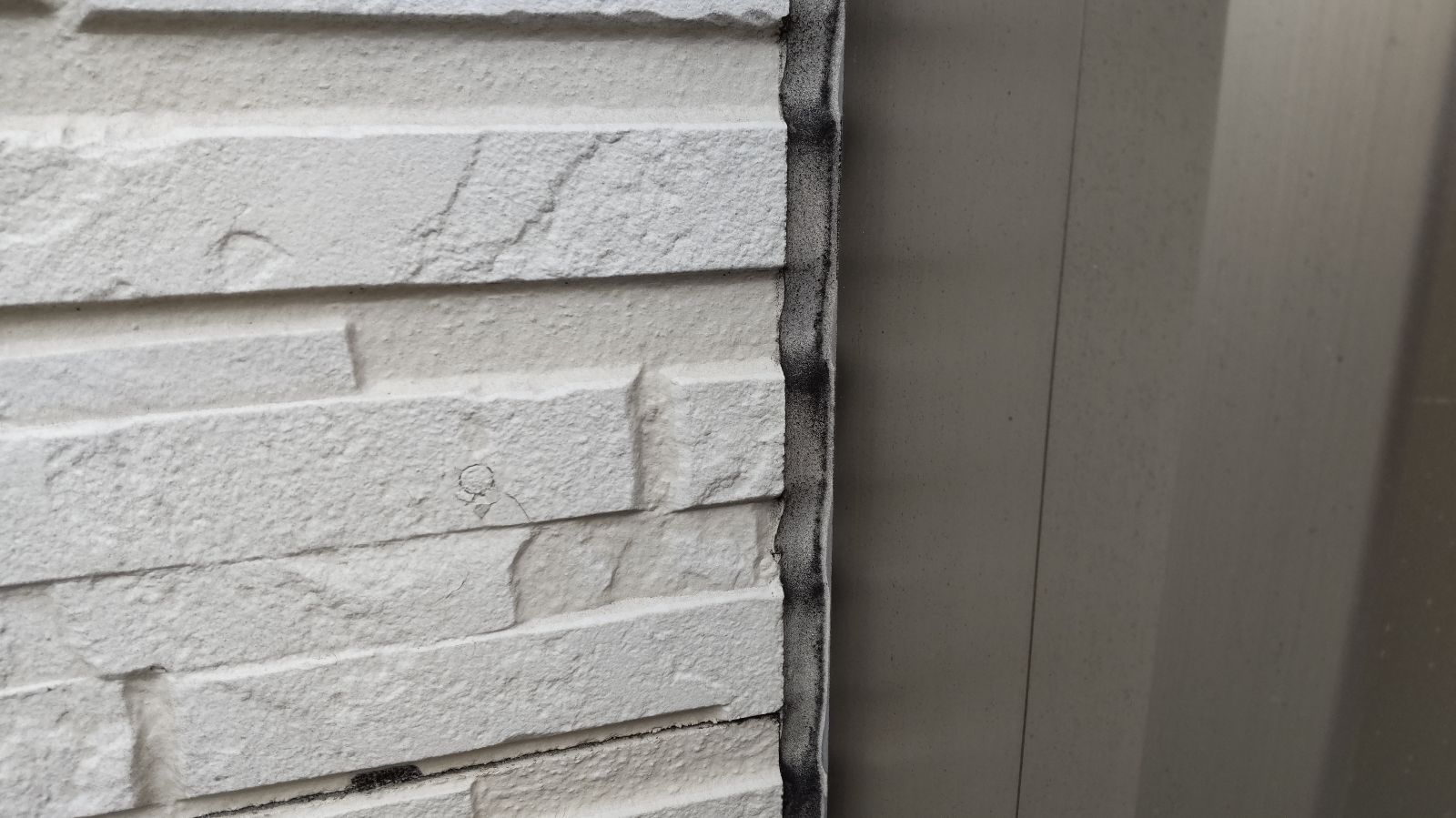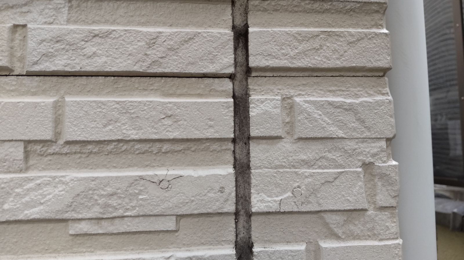 現地調査で最も顕著だったのが、外壁のシーリング劣化です。実際の写真にもある通り、黒ずみや裂け目が各所に見られました。特に白色系のサイディング部分では、シーリングの弾力性が完全に失われ、剥離やひび割れが多数確認されました。