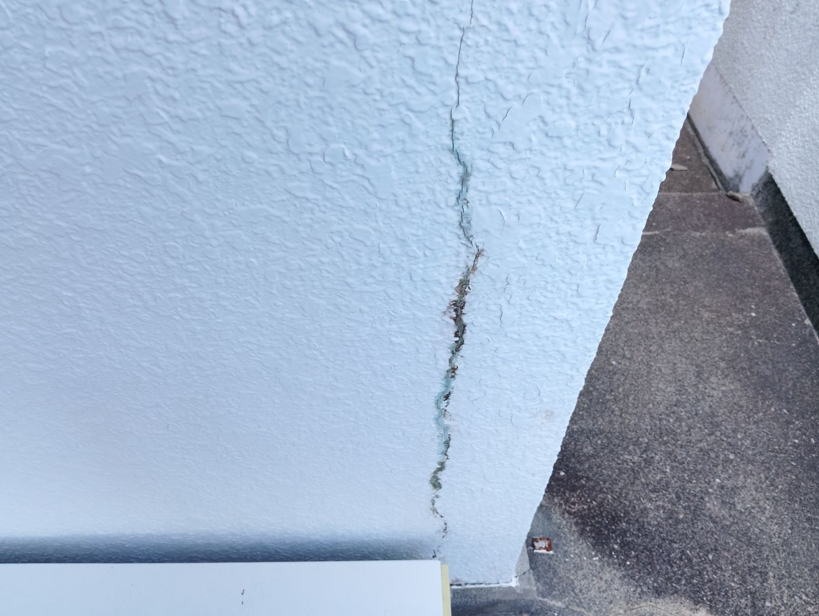 今回の現場で最も目立ったのが、外壁に多数見られた「クラック(ひび割れ)」です。ヘアークラック(0.3mm以下の表面的な細かいひび)から、0.5mm以上の構造クラックまで複数が確認されました。特に問題視されたのは、基礎から縦に走る構造クラックで、雨水が浸入すれば鉄筋の腐食や内部の劣化にもつながりかねません。