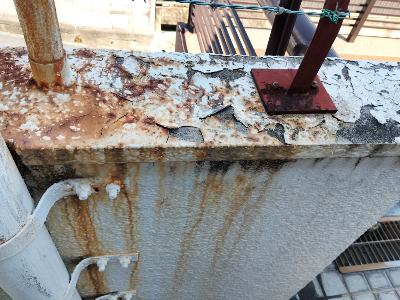ベランダの笠木部分で見られた爆裂と雨染みの原因|鉄筋腐食と防水層の劣化