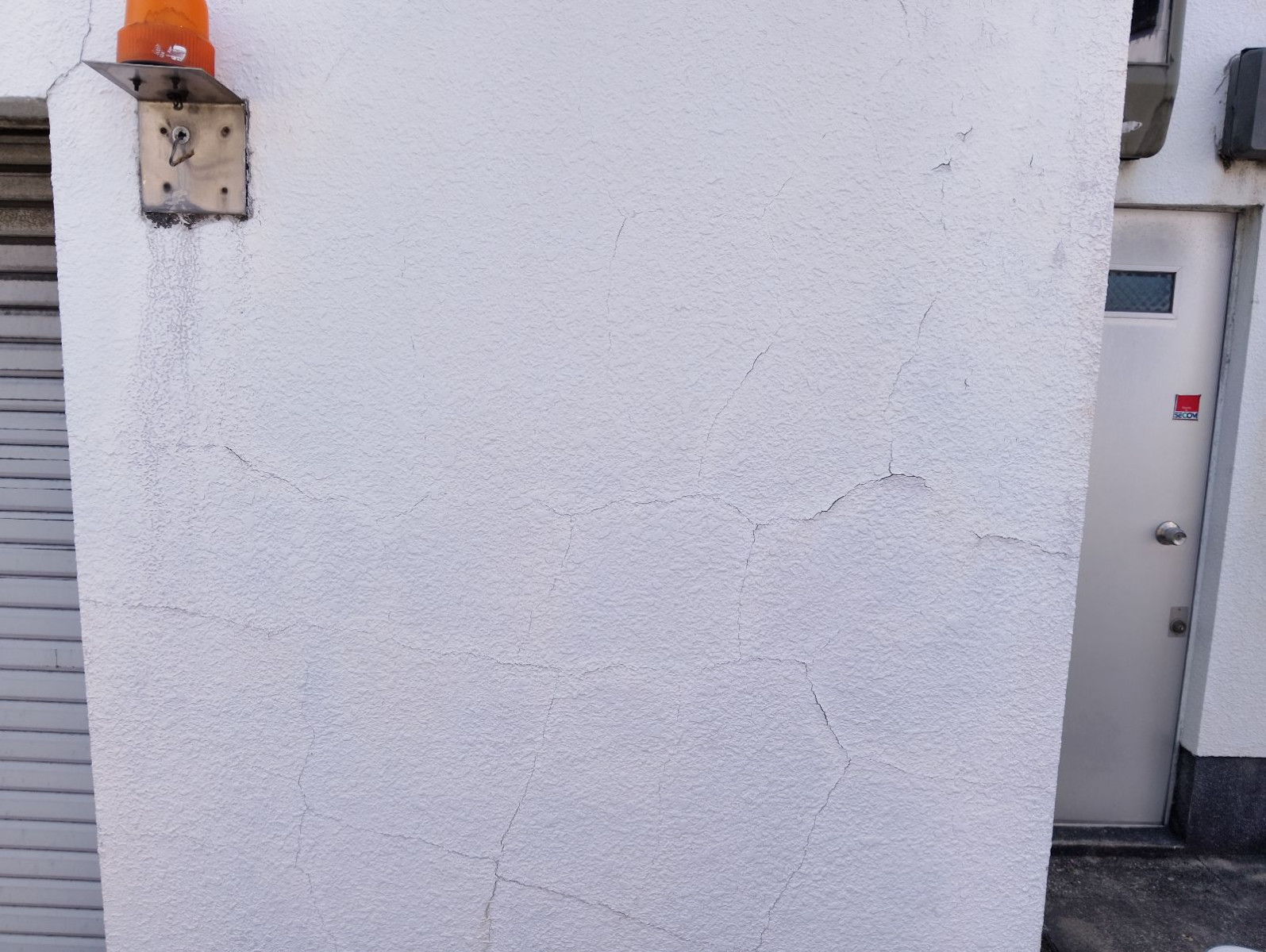 ひび割れがある壁面のほとんどは、旧塗膜の劣化や下地モルタルの動きによるものと推測されます。築年数を考慮すると、建物の揺れや熱収縮の繰り返しによって疲労が蓄積され、塗膜の柔軟性が追いつかなくなってきたと考えられます。