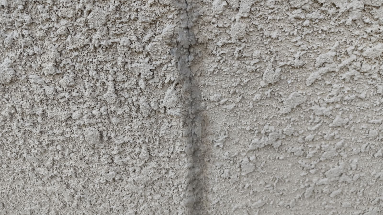 現地調査においてもっとも深刻だったのは、外壁に生じた大きなクラックと、細かく無数に入ったヘアクラックです。とくに窓サッシ周りや基礎近くに目立っており、これらは長年の雨風や振動による影響が積み重なった結果と考えられます。塗膜の防水性能が低下し、雨水が壁内に染み込み、構造材を傷めるリスクが出ています。