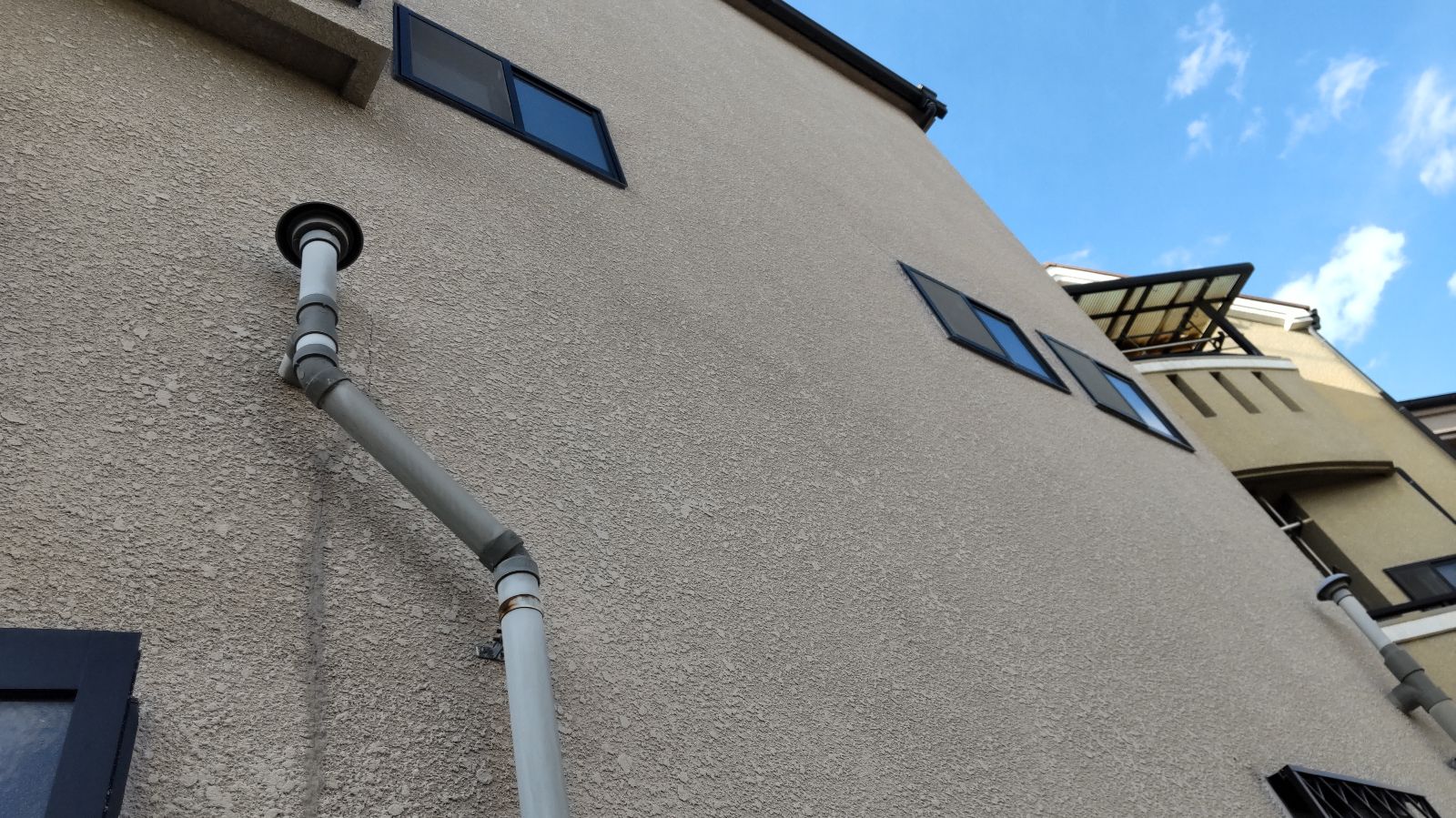 さらに、建物の裏手にまわると排水管の裏に植物が成長しており、壁と排水管の隙間に根を張っている可能性がありました。このまま放置すれば外壁の破損につながる恐れもあります。