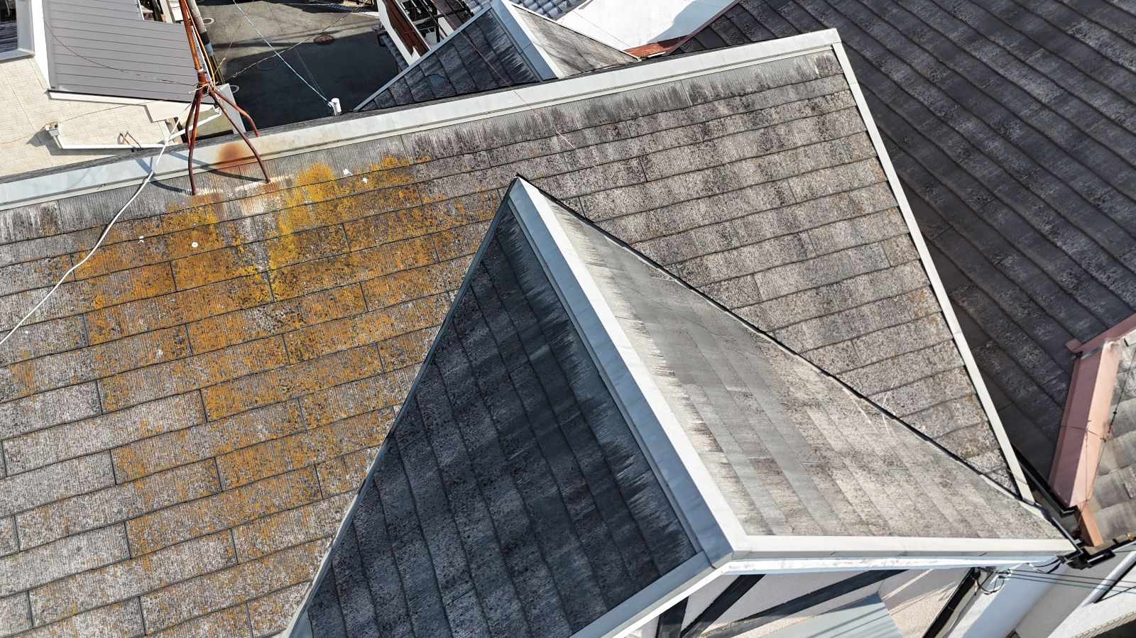 また、屋根の表面にはコケや藻の付着も見られ、撥水性が低下していることが明白でした。これを放置すると、スレート自体の吸水が進み、最悪の場合は凍害や割れを引き起こす恐れがあります。