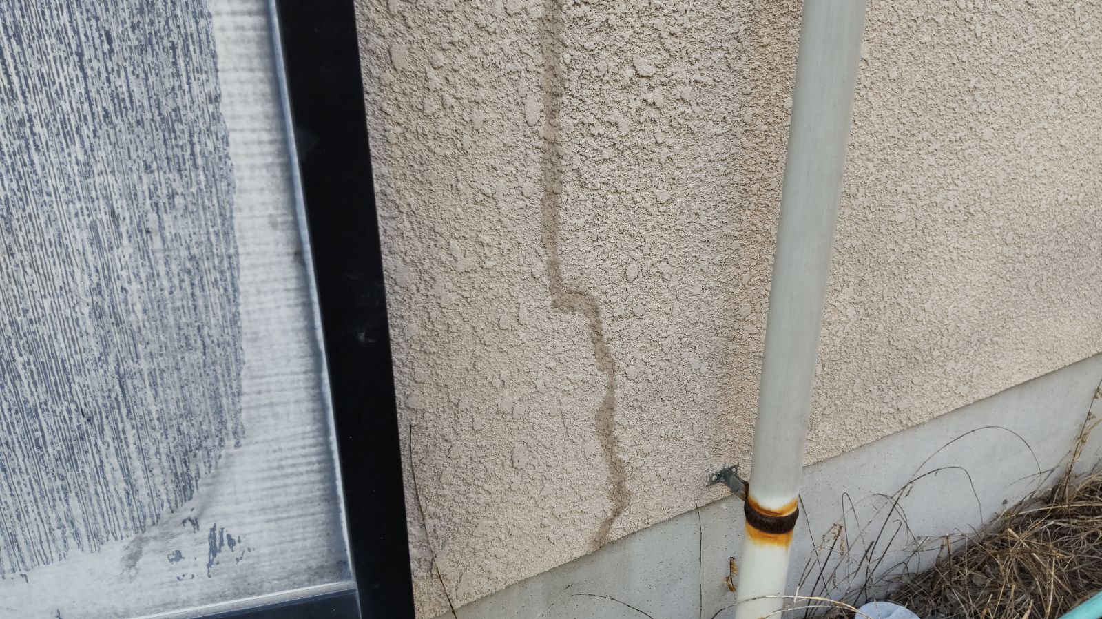 現場に到着すると、築20年以上の木造2階建て住宅が迎えてくれました。建物自体はしっかりしていますが、外壁全体に経年劣化が顕著に見られました。写真にもある通り、まず目に付いたのは外壁のひび割れ。窓サッシ横から基礎付近まで縦に走る大きなクラックが確認され、防水機能の低下が懸念されます。また、別の写真では外壁の目地部分にも開きがあり、雨水の侵入が容易な状態でした。