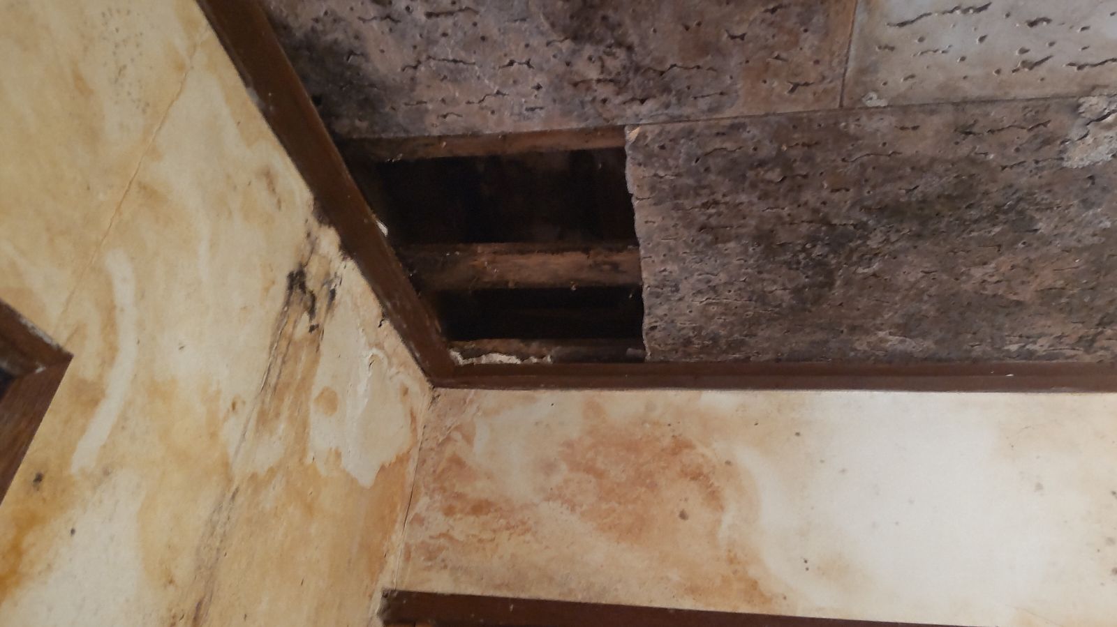 室内の天井部分において最も顕著だったのは、雨漏りによって生じた「カビの繁殖」と「野地板の腐食」です。雨漏りが天井材に染み込むことで、木材が腐食し、結果として天井の一部が崩れ落ちていました。この状態を放置すると、室内空間にカビの胞子が広がり、住人の健康を害する恐れがあります。