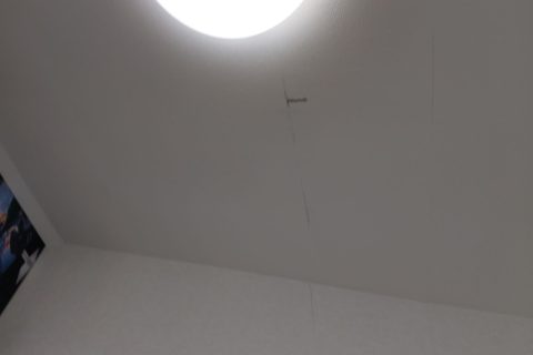 今回の調査でまず目についたのは、天井の雨染みです。照明周囲に現れており、クロスを伝って垂直に広がるシミが確認されました。これは屋根もしくは外壁からの水の侵入が、天井裏を通って室内に到達していることを示しています。