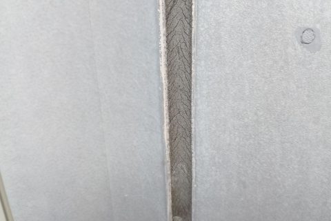 次に注目したのが、外壁サイディングの目地部分です。調査時に撮影した写真でもわかるように、コーキング材が大きく裂けており、下地が完全に露出している箇所が複数確認されました。これは雨水が直接内部に浸入できる状態であり、雨漏りの有力な原因と考えられます。