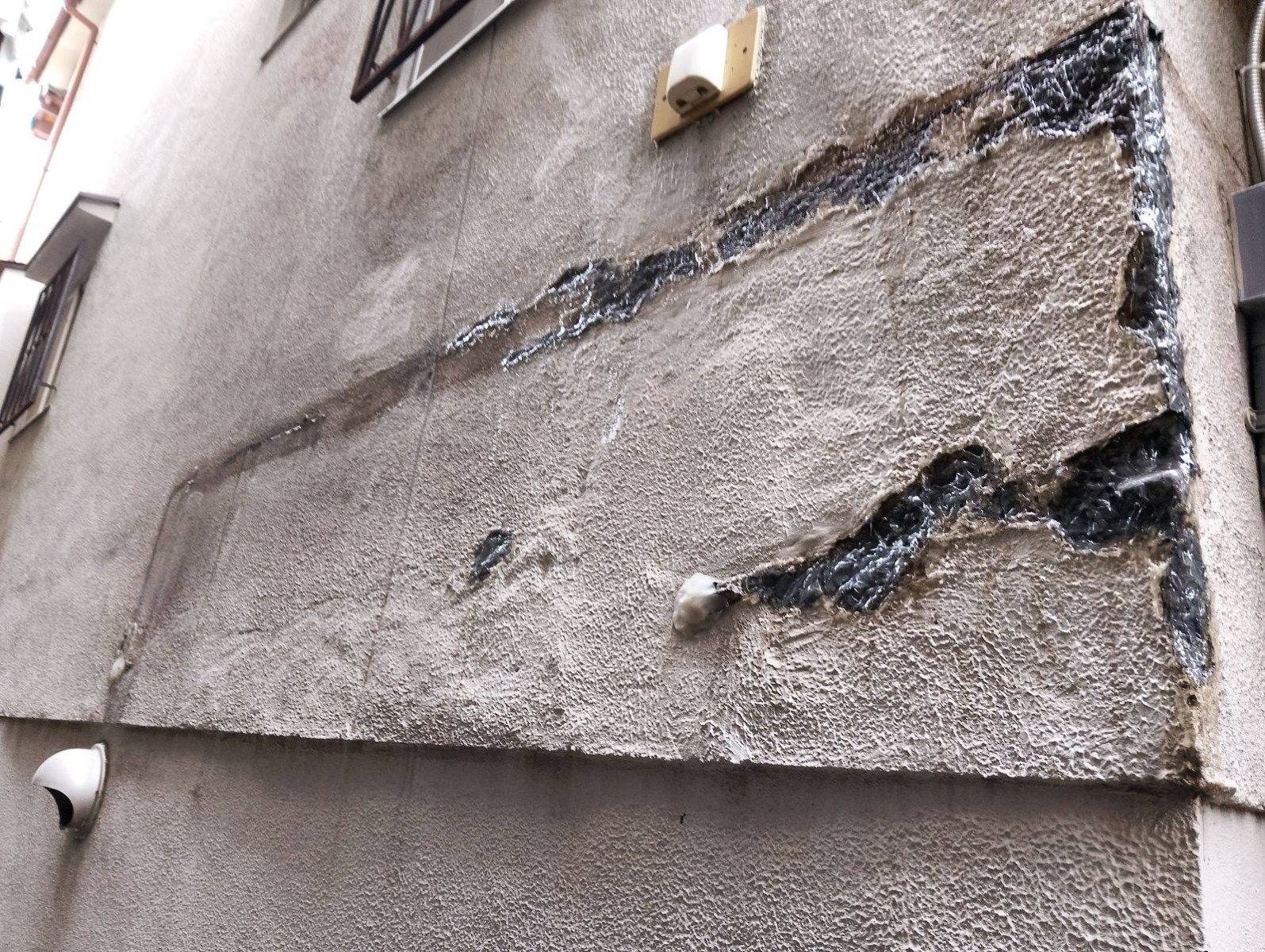 今回の住宅では、築年数が30年以上経過しているとのことで、モルタル仕上げの外壁に劣化が集中していました。調査時、特に目立っていたのがモルタル層の剥離と、下地にまで到達するクラック(ひび割れ)の存在です。