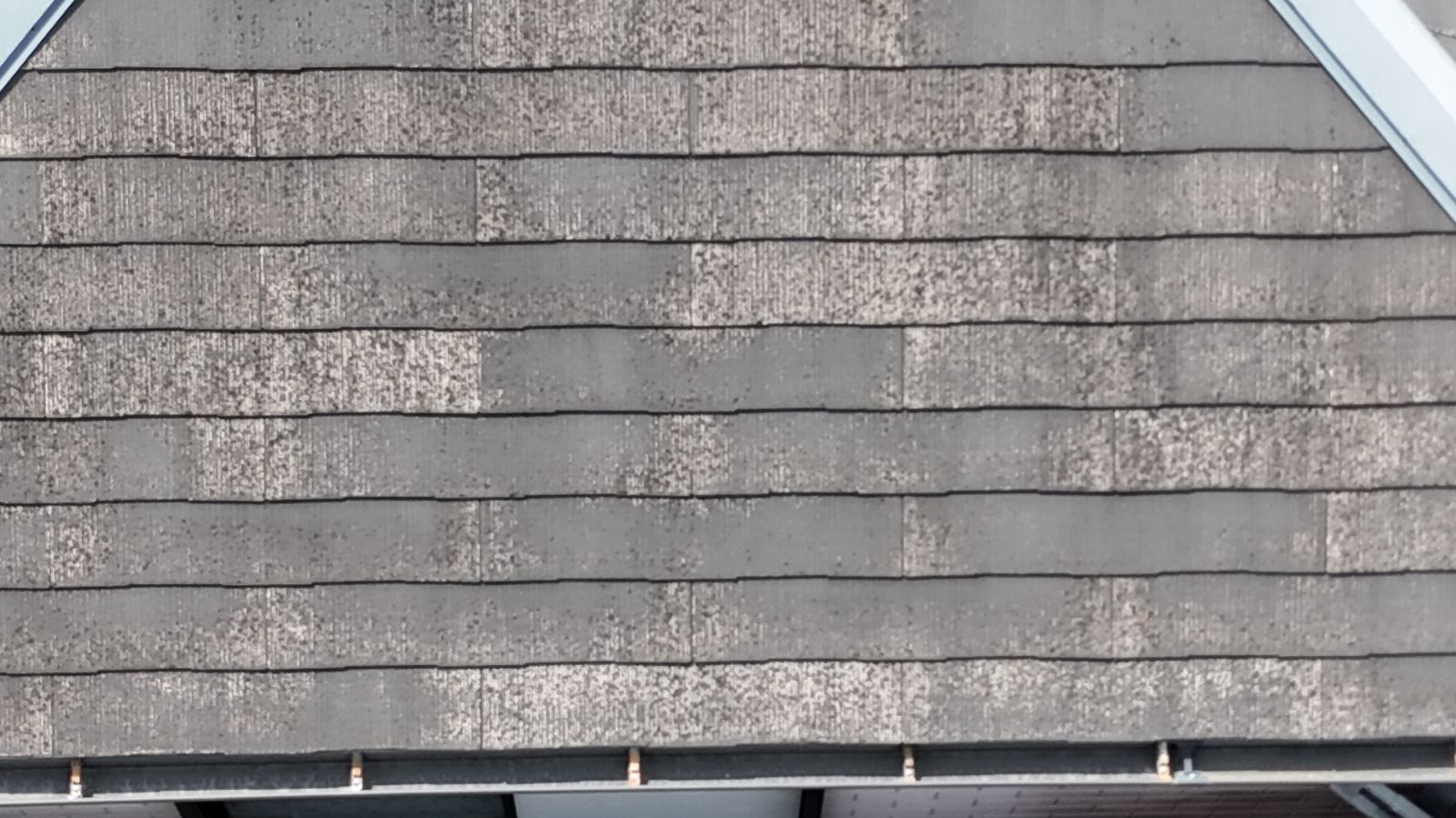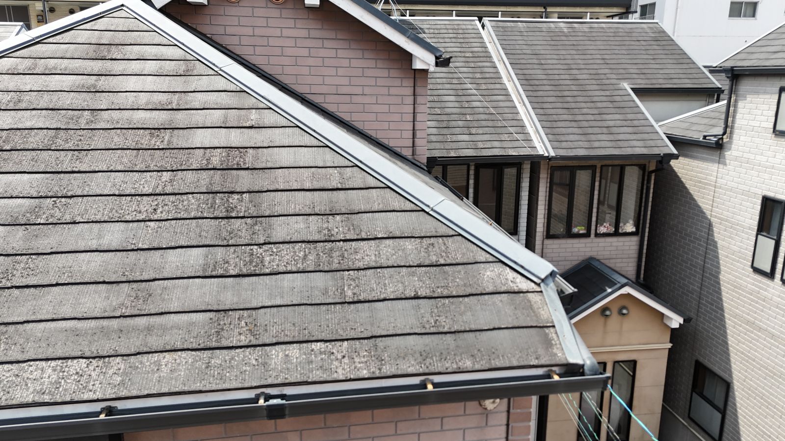 写真をご覧いただくと分かる通り、屋根材はスレート瓦で、全体的に表面の塗膜が著しく劣化しており、色むらや黒ずみ、苔の付着が多数確認されました。特に日当たりの悪い北面では苔の繁殖が目立っており、排水溝周辺には詰まりの兆候も。これは、放置すると雨漏りリスクを高める原因になります。