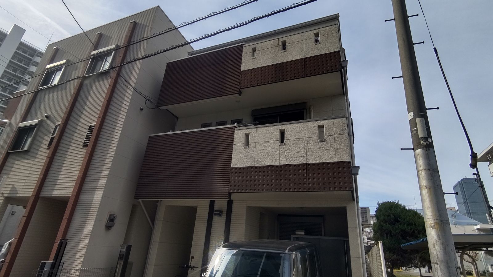 今回の現地調査は、大阪市城東区鴫野西にある3階建ての戸建住宅にて実施いたしました。ご依頼内容は「外壁塗装」と「ベランダの防水工事」で、築年数から見てそろそろ全体的なメンテナンスが必要とされる時期に差し掛かっている建物です。現場には車で向かい、途中の大通りでは信号渋滞が少しありましたが、周囲は閑静な住宅街で落ち着いた雰囲気。到着時、施主様は快く迎えてくださり、ご不安な箇所を丁寧にご説明いただきました。