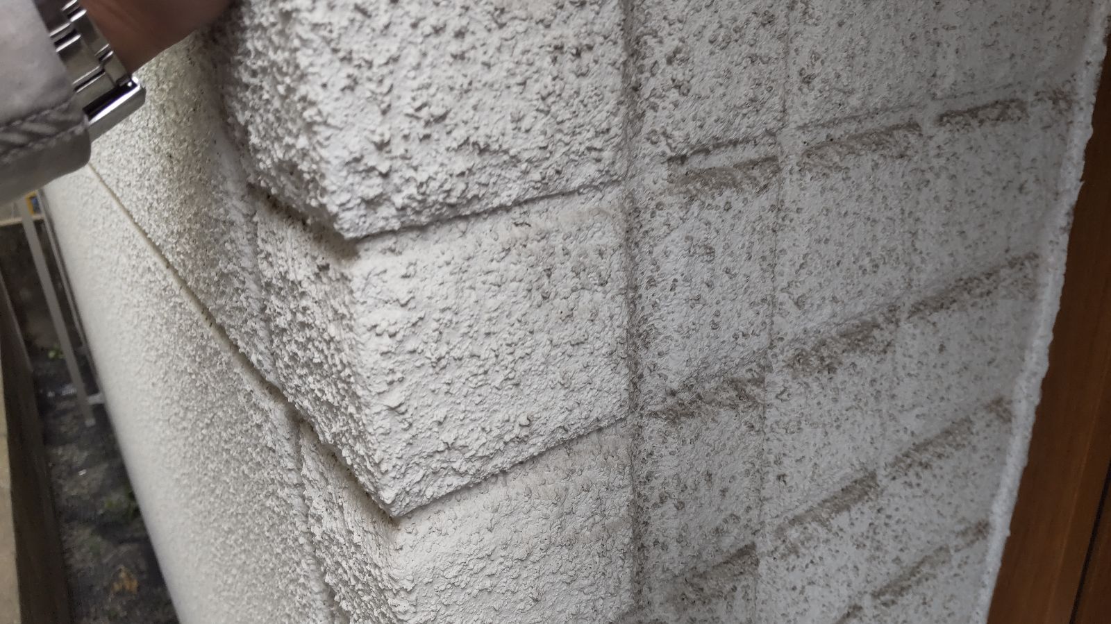 まず外壁表面に触れると、指先には白い粉が付着しました。これは塗膜の劣化によって起きる「チョーキング現象」で、塗料の防水性や耐久性が著しく低下している証拠です。また、目地のシーリング部分にも明らかな劣化が確認でき、硬化し始めており、場所によっては隙間が発生している部分もありました。