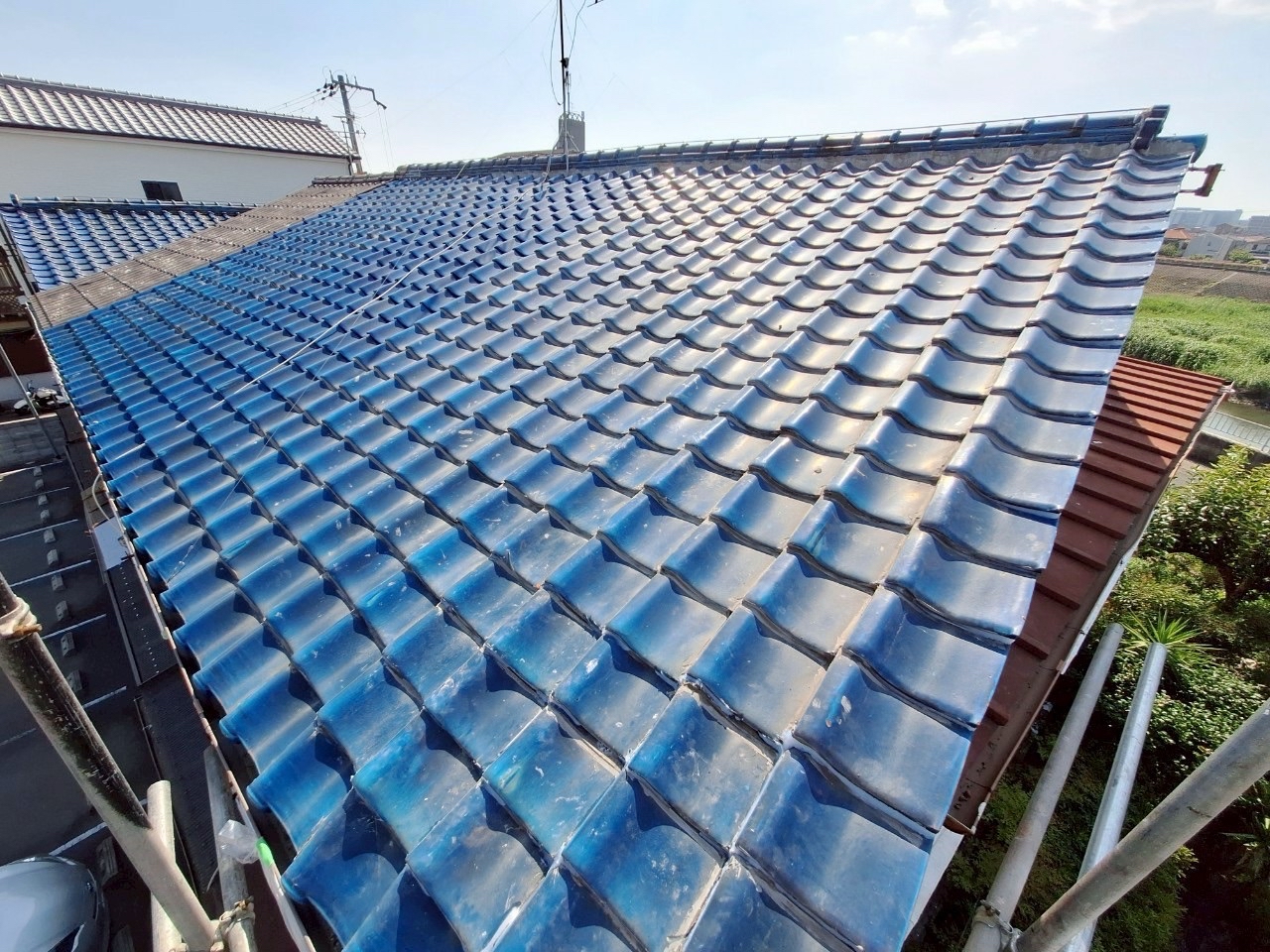 屋根に登って瓦の状態を調べると、表面に光沢はあるものの、一部瓦のズレや固定不良、瓦の割れが複数箇所で確認されました。特に南面の屋根では風の影響を強く受けており、飛散リスクも高まっていました。