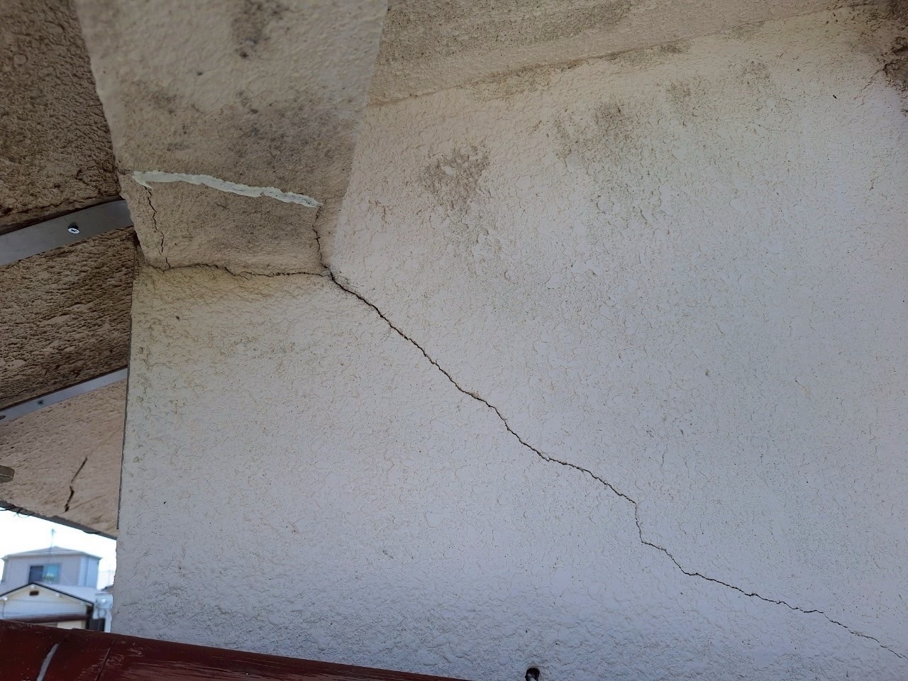 まずは目視で外観をチェック。写真1枚目の通り、屋根裏付近の外壁に大きく走るクラック(ひび割れ)を確認。構造的な歪みや雨水の侵入が懸念される状態でした。次に、軒天部分の調査を行ったところ、雨染みや腐食の兆候が多数見られました。ここからも、経年劣化がかなり進んでいることが分かります。