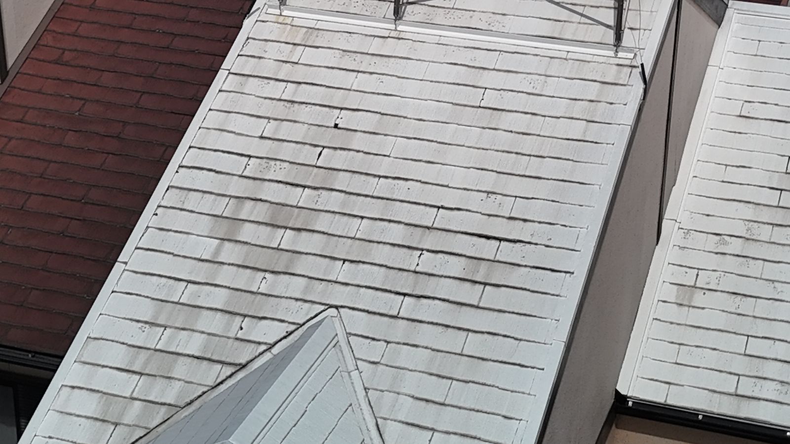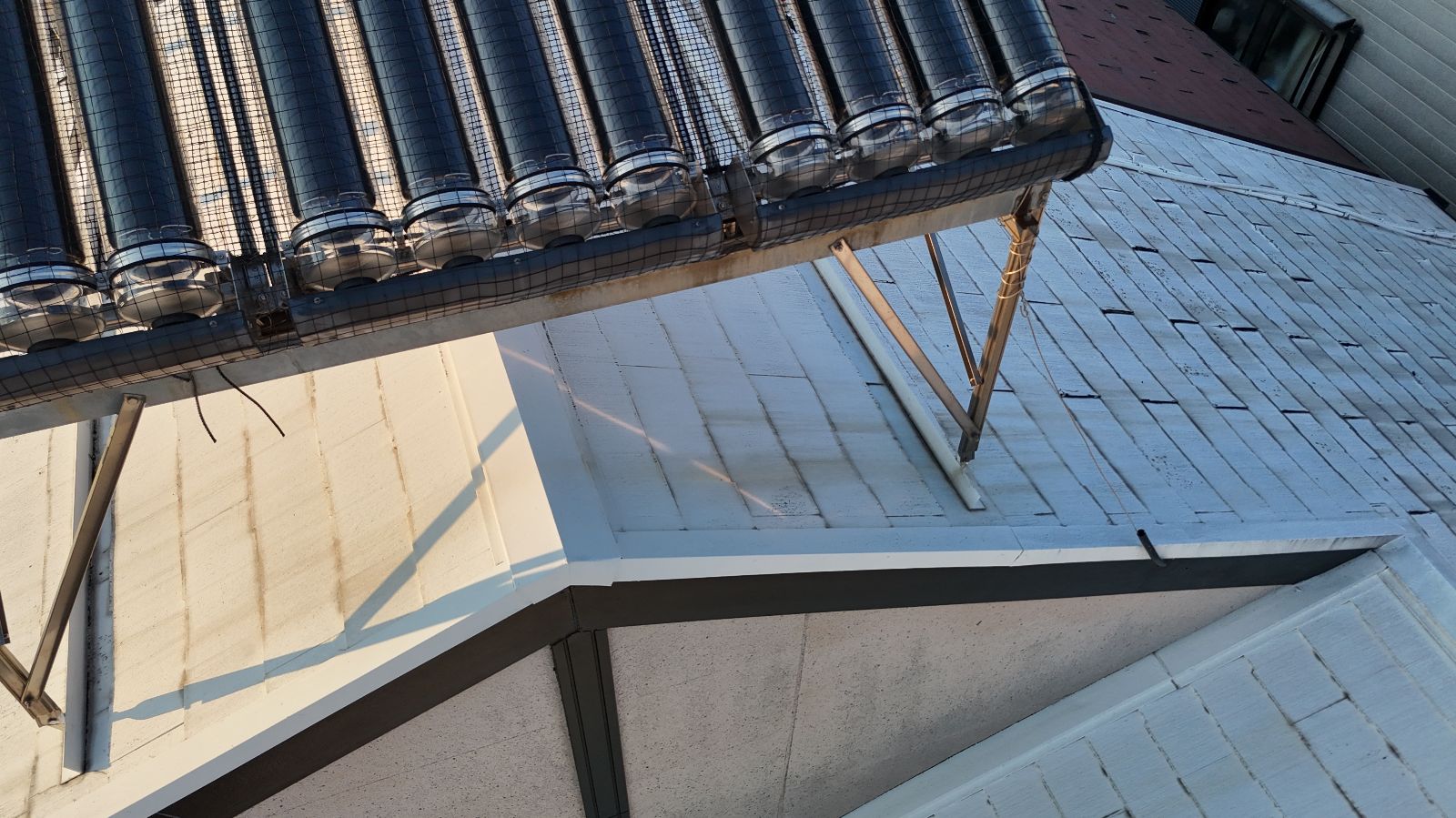 太陽熱温水器の撤去もあわせて行うことで、屋根材の重量負担が軽減され、屋根構造への負担も最小限に抑えることが可能です。今回の調査では、屋根全体の劣化とあわせてこの設備の撤去が効果的であると判断しました。