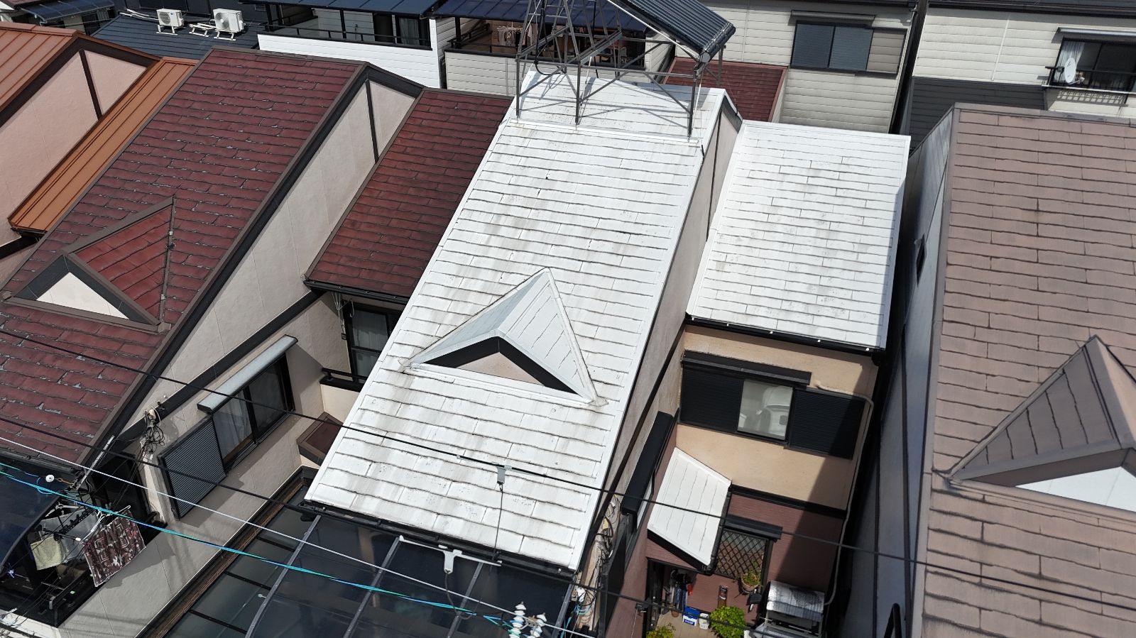 大阪府摂津市新在家で実施した屋根カバー工法の現地調査では、屋根全体の経年劣化が明確となり、既存屋根材の再利用が難しいと判断しました。ドローン調査による詳細な可視化、太陽熱温水器の荷重による影響、苔やカビの繁殖状況など、見えにくい問題点も洗い出せたことで、最適な工法として屋根カバー工法をご提案する運びとなりました。