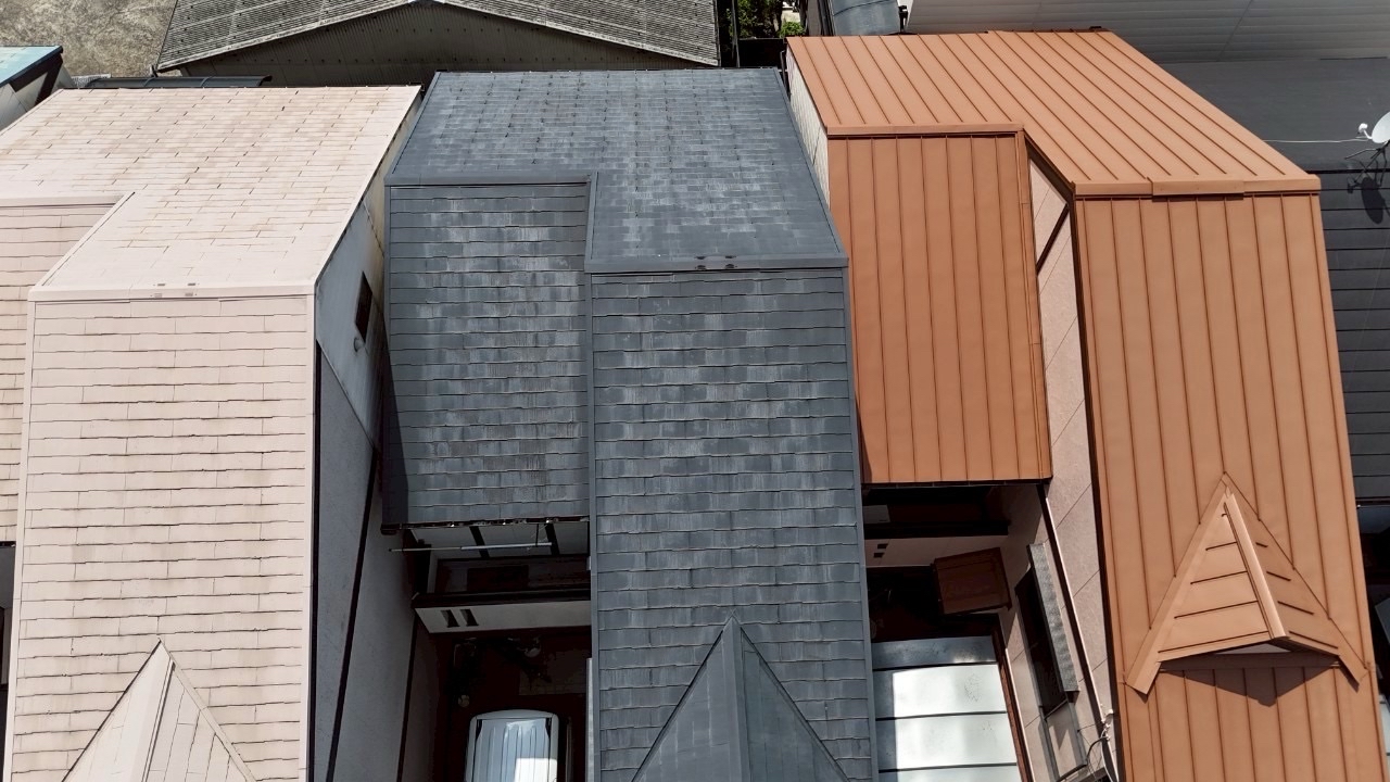 屋根の劣化に対する機能面での対応も重要ですが、今回の新在家の現場では、周囲の住宅と調和する外観デザインも考慮したご提案を行いました。特にドローン撮影で確認した俯瞰画像からは、周囲の家々がそれぞれ異なるカラーの屋根を持っていることが分かり、「目立ちすぎず、でも古さを感じさせない色味」に仕上げることが求められます。