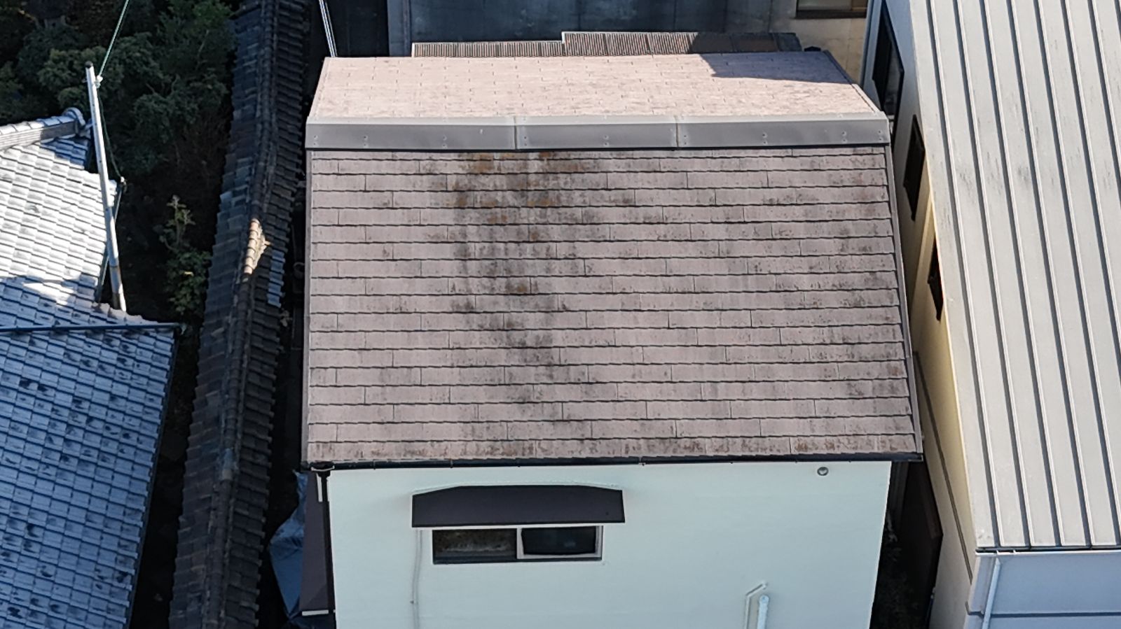 撮影画像を確認すると、屋根中央部分に広範囲にわたる黒ずみ汚れが見受けられました。これは経年によるカビやコケ、あるいは空気中の粉塵が付着したことによるものと推測されます。特に北側の屋根面に顕著で、日照時間が短いため湿気が溜まりやすいことが一因です。