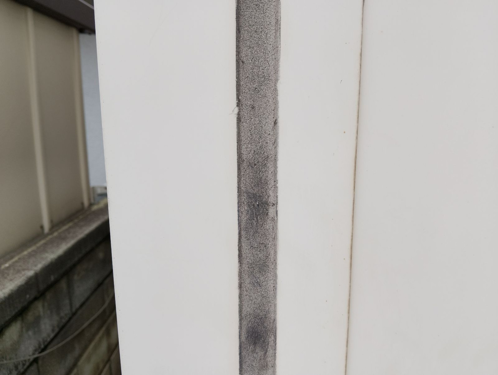 写真にあるように、コーキングが痩せて隙間が空いてしまっており、これは内部に雨水が入り込んでいる可能性を示唆しています。また、サイディング自体の表面にもチョーキング現象(触ると白い粉が付着する劣化症状)が確認されました。これは塗膜の保護効果が薄れているサインであり、外壁材が直接紫外線や雨風の影響を受けてしまっている状態です。