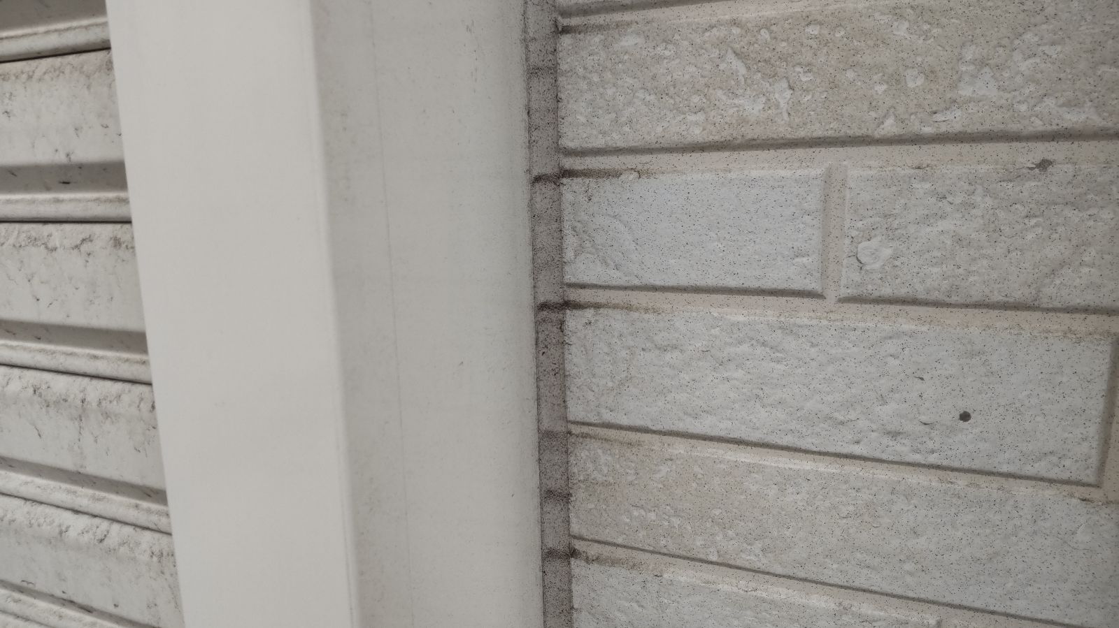 今回のお住まいは築15年ほどの戸建住宅で、外壁には窯業系サイディングが使用されていました。一見するときれいに保たれているように見えますが、よく観察するとコーキングの劣化や黒ずみ、窓周りのカビのような汚れが目立ち始めていました。まず目に入ったのが目地のコーキング部分。肉やせ、ひび割れ、さらには一部で剥離も確認されました。これは経年劣化によって柔軟性が失われ、雨水や湿気が入り込む原因になります。
