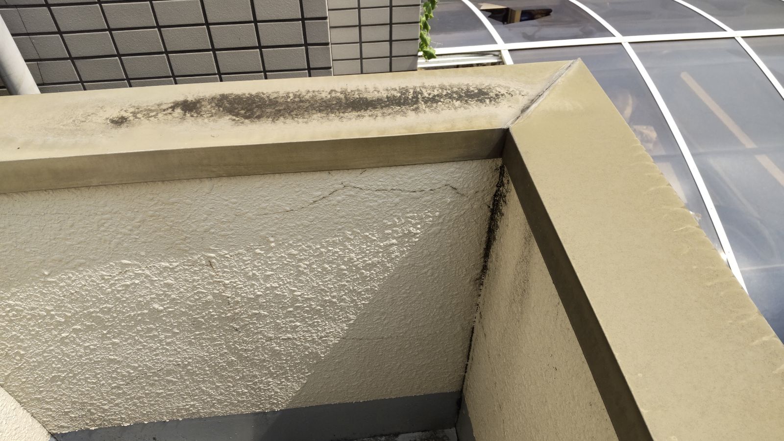 ベランダの手摺壁や笠木部分には、長年の風雨にさらされた結果として、黒ずみ汚れと表面の小さなクラックが発生していました。この部分は常に外気にさらされているため、塗膜の劣化が進行しやすく、雨水の浸入ポイントにもなりやすい箇所です。