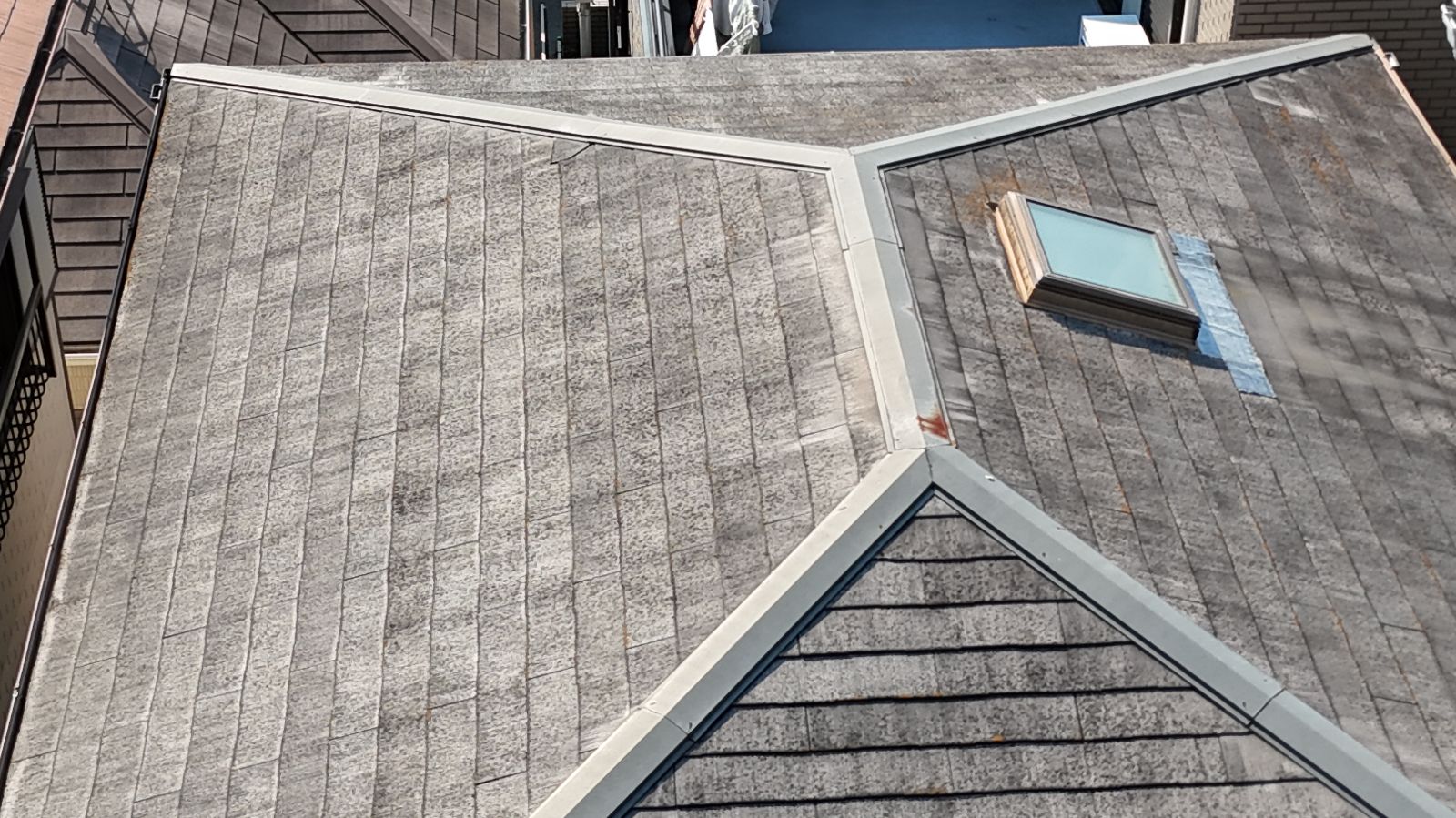 まず屋根は、スレート材の表面が広範囲にわたり褪色しており、防水性の低下が見られます。また、棟部分に若干のズレも確認され、今後の台風シーズンを考慮すると補強と塗装が必須と判断しました。