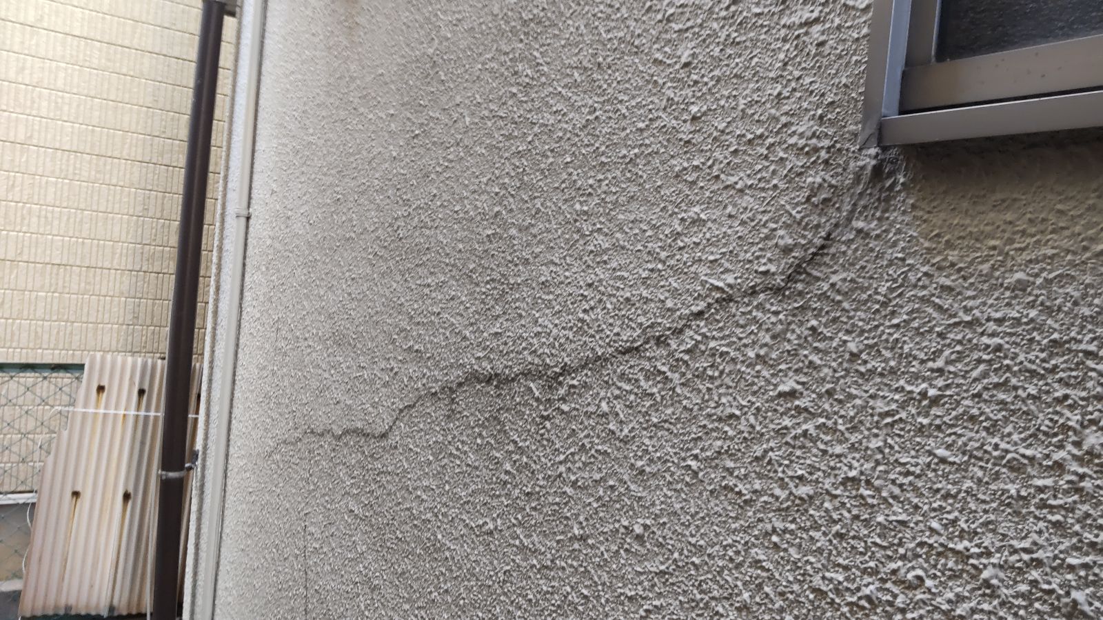 現地調査では、外壁の複数箇所で構造クラックやモルタルのひび割れが見受けられました。とくに窓まわりや建物の継ぎ目、地面に近い部分では大きな亀裂もありました。これは気温差や振動による建物の動きに追従できなかった塗膜の劣化が要因と考えられます。