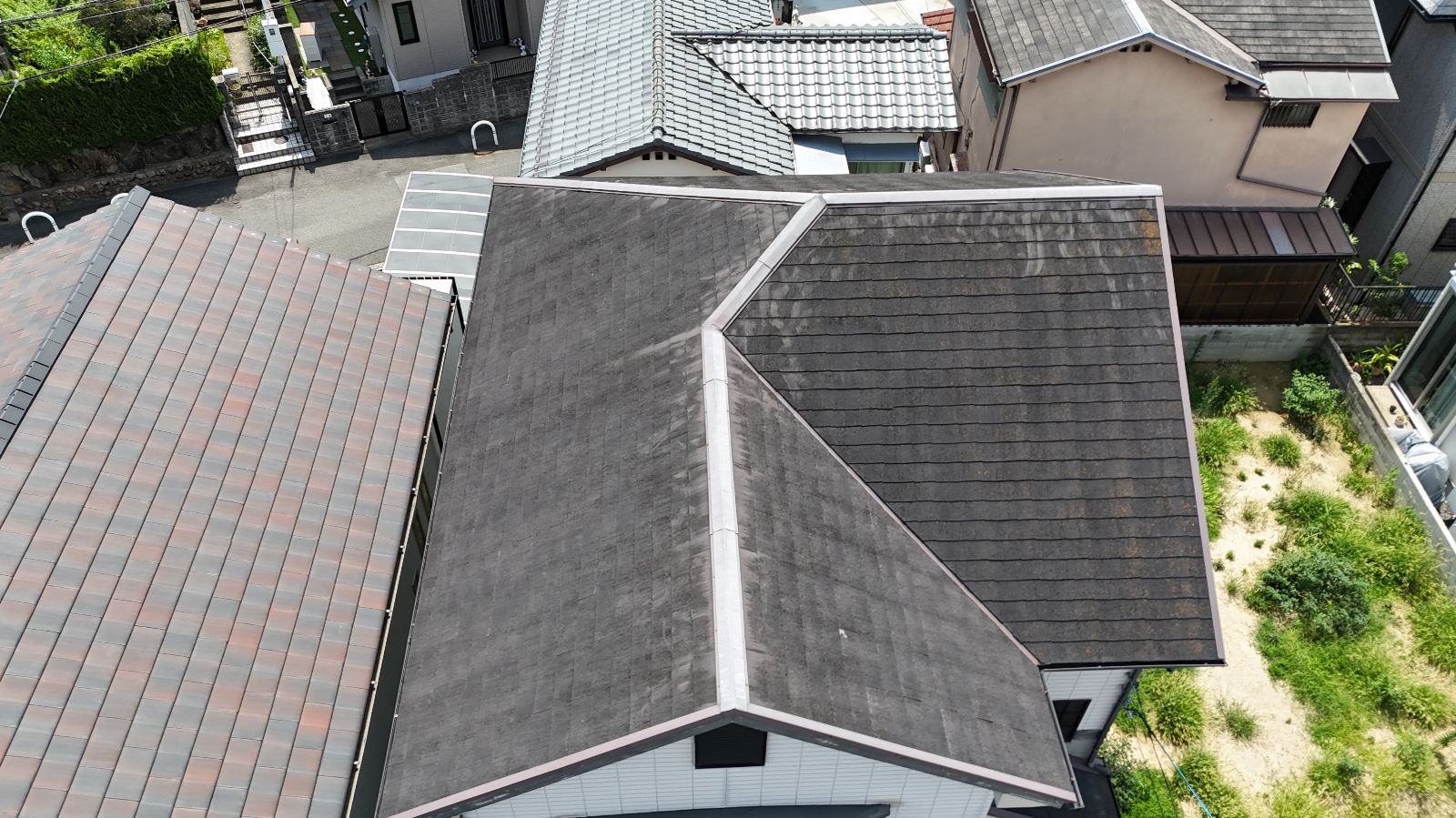 屋根についてはドローン調査を実施し、上空から全体の状態を確認しました。使用されているのはカラーベスト(スレート系屋根材)で、築年数から見て過去に一度も塗装メンテナンスがされていないことが伺えました。屋根の表面は紫外線や風雨にさらされ続けるため、塗膜の劣化は避けられません。