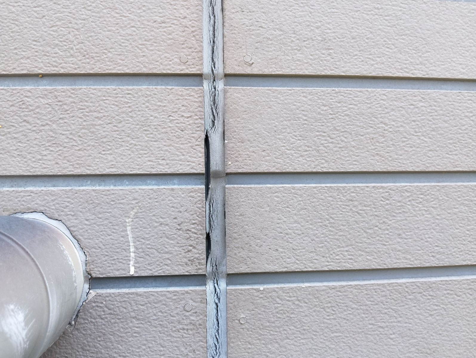 このような状態が続くと、隙間から雨水が侵入し、外壁材の内部にまで水が入り込む恐れがあります。内部の木材が腐食したり、カビやシロアリの発生原因にもなりかねません。写真にあるように、隣接する排水管付近も目地が割れており、配管との接合部分から雨水が回り込む危険性も高いです。