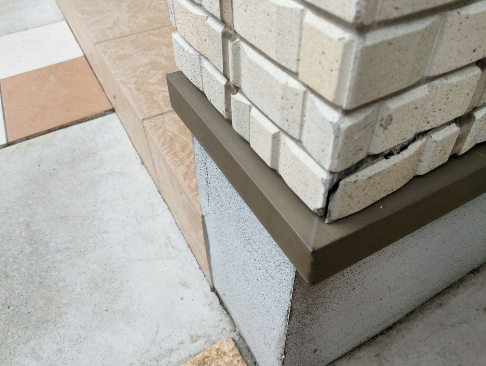 さらに、家の角部分ではタイル調の外壁材に浮きや剥がれが見受けられ、見た目だけでなく建物の耐震性にも関わる問題が潜んでいます。基礎部分との取り合いにズレがあることからも、長期的には構造に負荷がかかるリスクがあると判断しました。