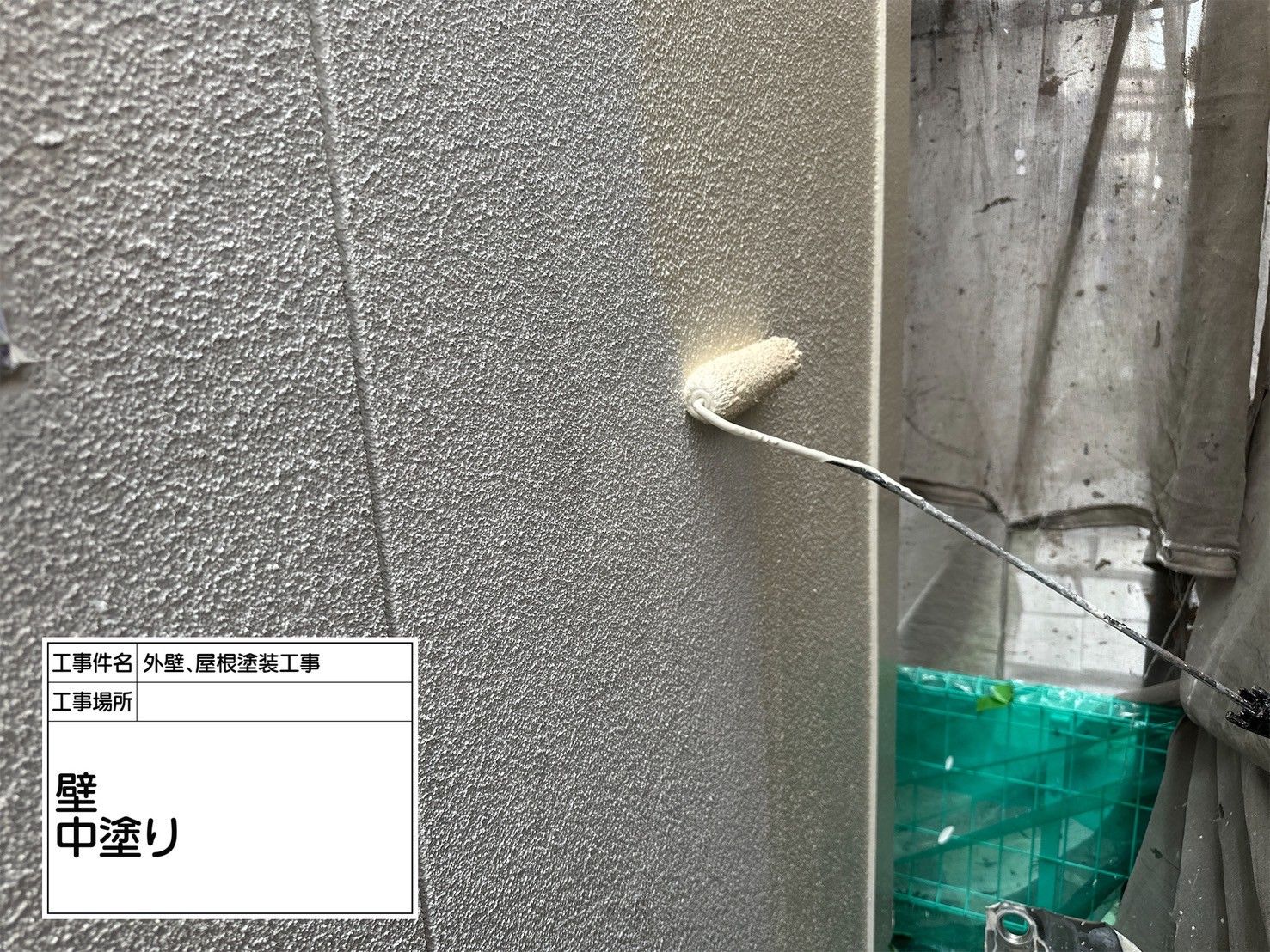 今回の吹田市の現場では、複数の中塗り工程を1日にまとめて行いましたが、それぞれの工程で意識すべきポイントが異なります。まず外壁の中塗りでは、凹凸面をしっかりと塗り込むために、ローラーの毛丈選びや塗り重ねの方向が重要です。塗りムラを防ぐため、塗布スピードを一定に保ち、隣接面とのつなぎ目には特に注意を払いました。