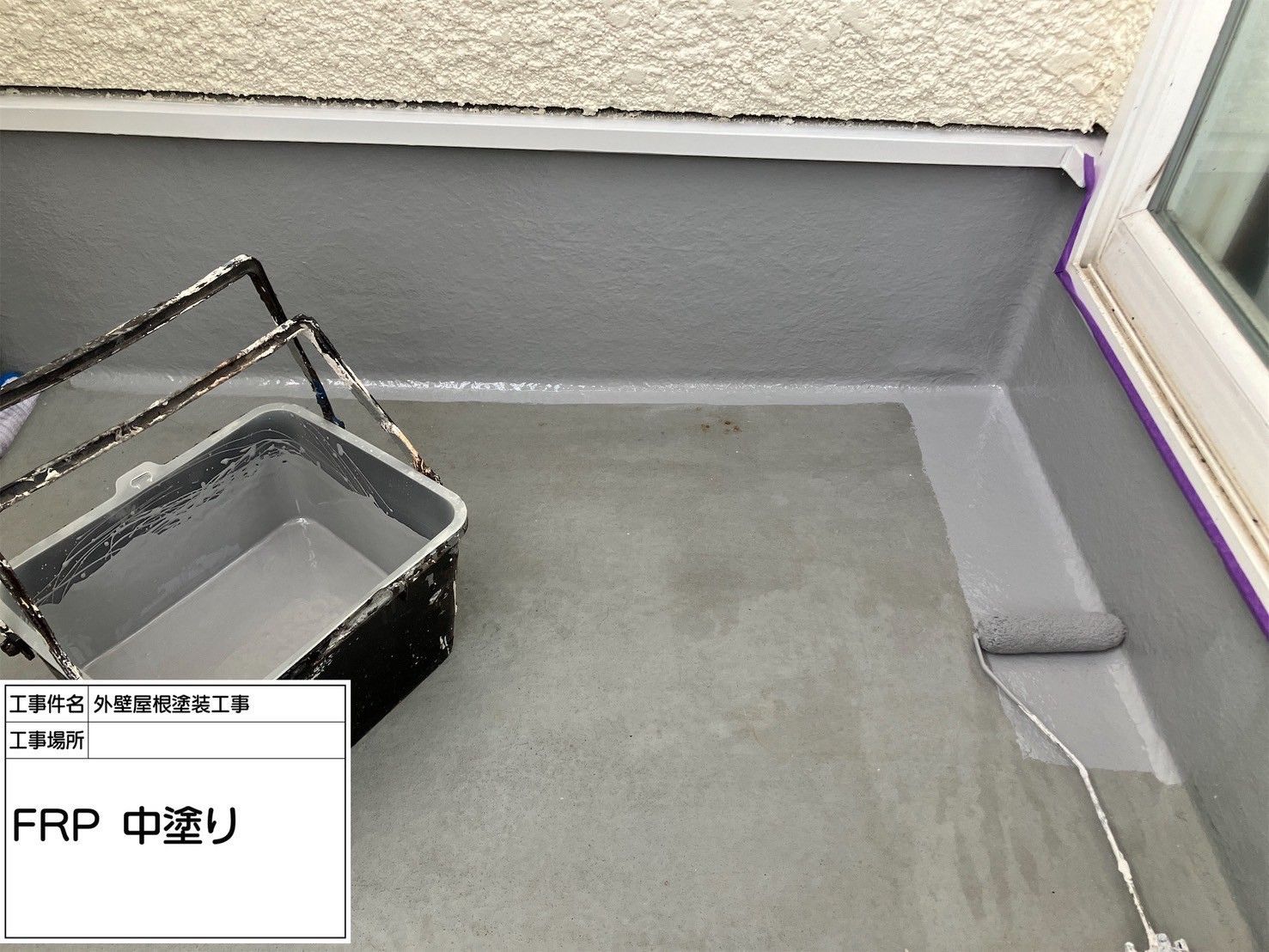 施工前の状態は、既存の防水層が経年劣化により若干のクラックが見られましたので、下地処理としてサンディングとプライマー塗布を実施。その後、中塗りとして専用のFRP樹脂をローラーで丁寧に塗布しました。ローラーの動かし方やスピードにも細心の注意を払い、空気が混入しないよう一定の圧力で均一に塗り重ねています。