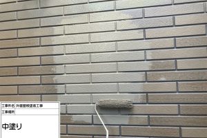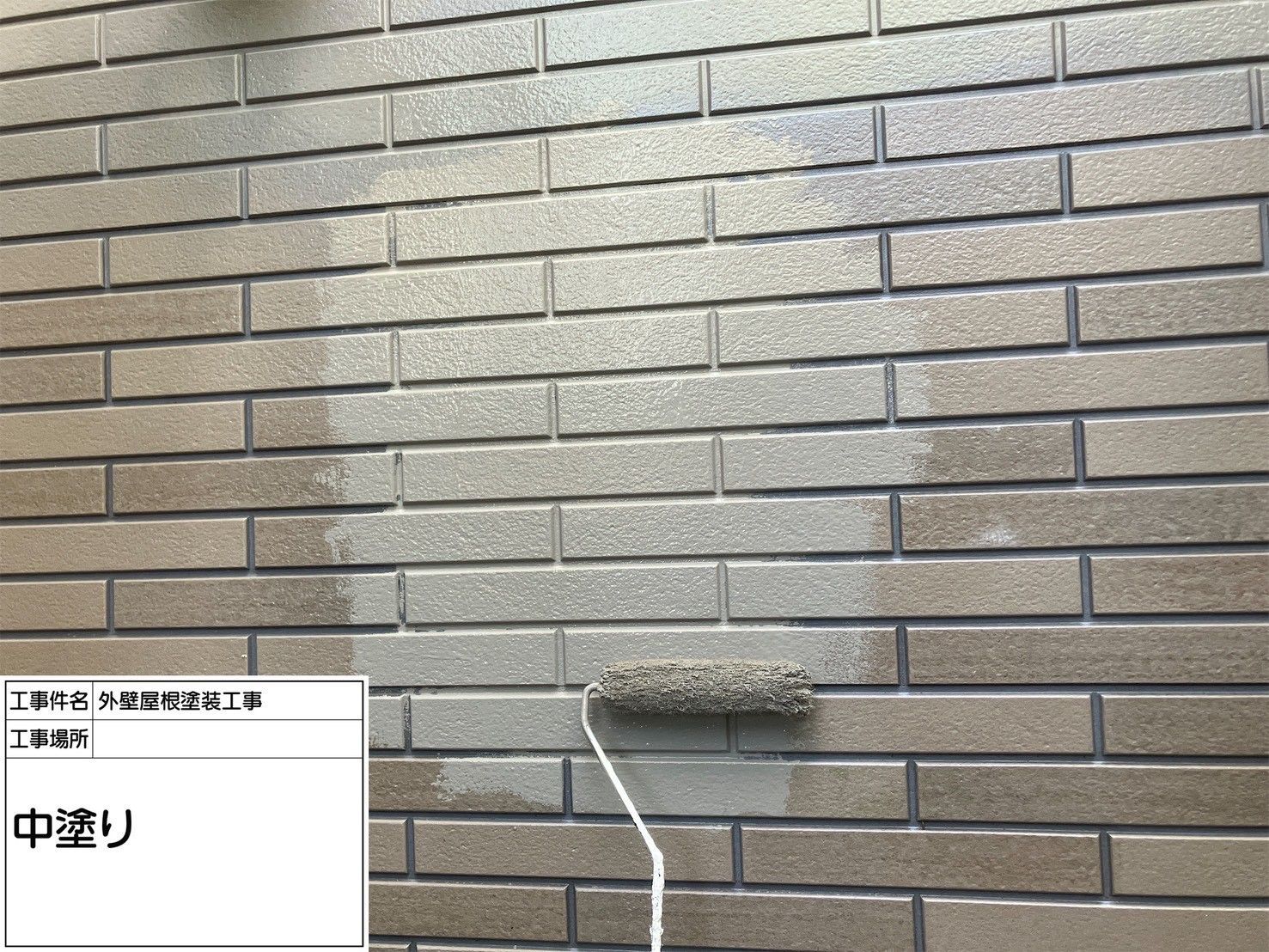 タイル調サイディング外壁の場合、目地部分と表面部分で塗料の乗り方が異なるため、ムラが出やすいという特徴があります。そのため、中塗りでは一度で仕上げようとせず、塗り重ねを意識した施工が重要になります。写真でも分かるように、色が揃い始めた段階で細かな凹凸が強調され、外壁本来の意匠性が引き立ってきました。