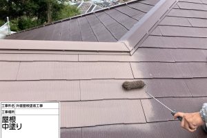 屋根は外壁以上に紫外線や雨風の影響を受けるため、中塗りで十分な塗膜厚を確保することが不可欠です。塗膜が薄いと、上塗りを行っても耐久性が確保できず、色あせや劣化が早まる原因になります。今回の現場では、ローラーを使い、屋根材の重なり部分まで塗料をしっかり行き渡らせる施工が行われていました。
