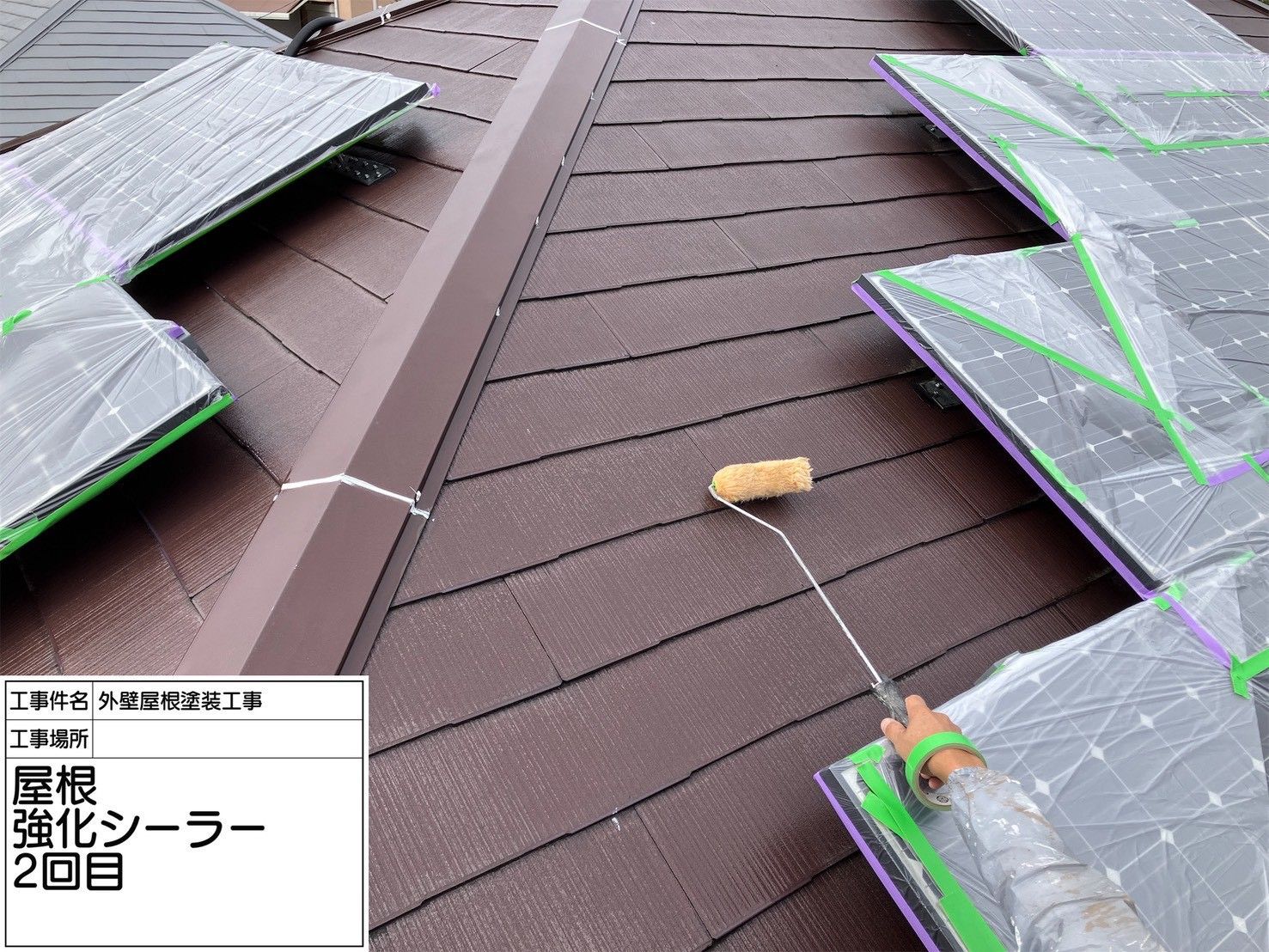 特にスレート屋根は経年劣化により表面が乾燥し、塗料の吸い込みが激しくなります。1回目のシーラーで屋根材に浸透させ、2回目で表面を均一に整えることで、塗料の密着性と耐久性を大幅に向上させることができます。写真からも分かる通り、太陽光パネルは丁寧に養生され、パネル周辺までムラなくシーラーが塗布されています。