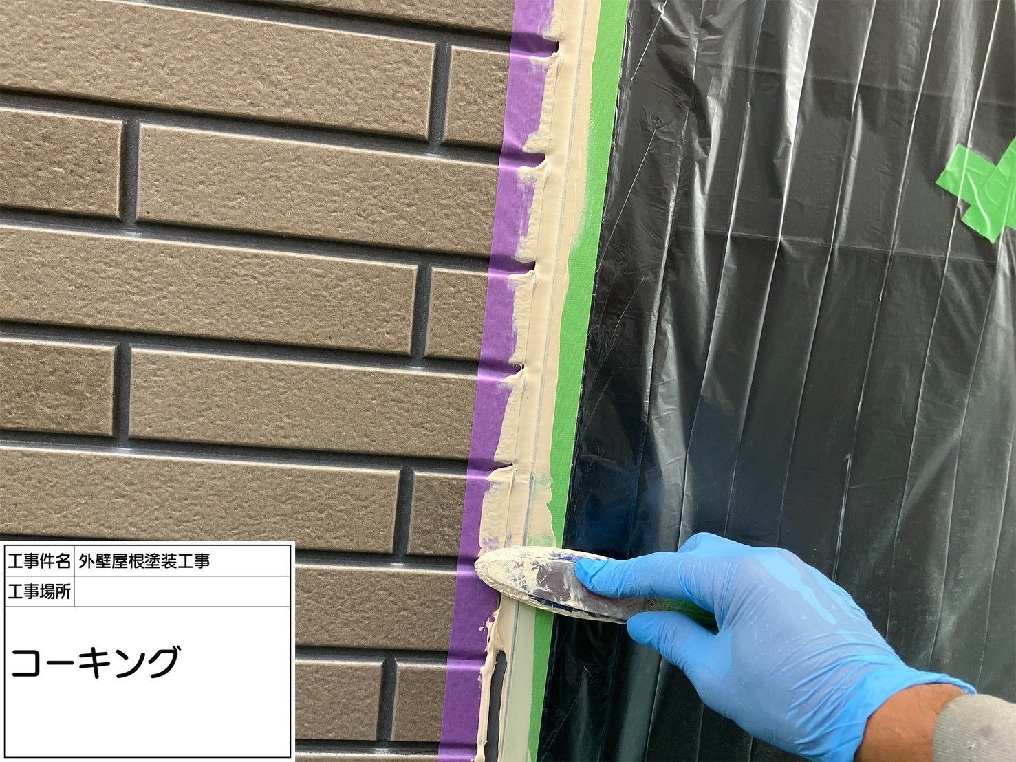 コーキング工事では、まず古いコーキング材を撤去し、プライマーを塗布してから新しいコーキング材を充填します。この下準備を怠ると、どれだけ高品質な材料を使用しても早期剥離の原因になります。写真に写っているように、養生を丁寧に行い、ヘラで均一に押さえることで、見た目だけでなく性能面でも優れた仕上がりになります。
