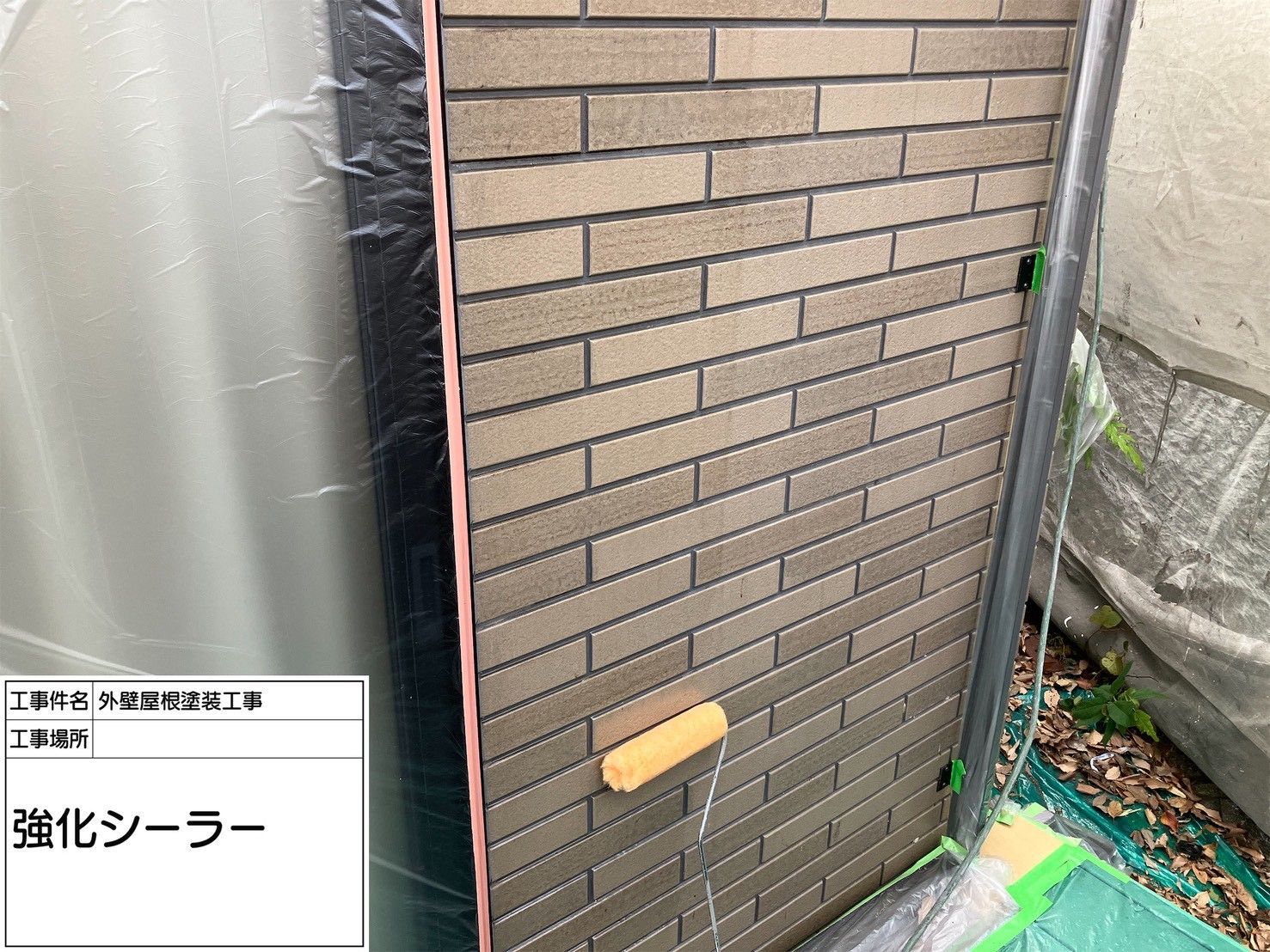 外壁材は経年劣化により塗料を吸い込みやすくなっています。シーラーを塗布せずに塗装を行うと、塗料が必要以上に吸い込まれ、色ムラや早期劣化の原因となります。今回の現場では、ローラーを使用し、塗り残しが出ないよう丁寧に強化シーラーが施工されており、下地がしっかり整えられていることが確認できました。
