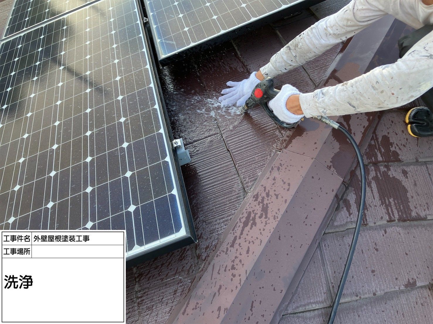 また、太陽光パネル自体の洗浄についても、専用の方法を用いなければ発電効率の低下やパネル破損の原因となります。今回は屋根塗装前の洗浄工程として、パネル周辺を中心に丁寧な作業を行い、汚れをしっかり除去しました。屋根高圧洗浄を行うことで、塗装の仕上がりが良くなるだけでなく、太陽光パネルの発電効率改善にもつながるため、吹田市で太陽光パネル付き住宅の塗装を検討されている方には特におすすめしたい工程です。