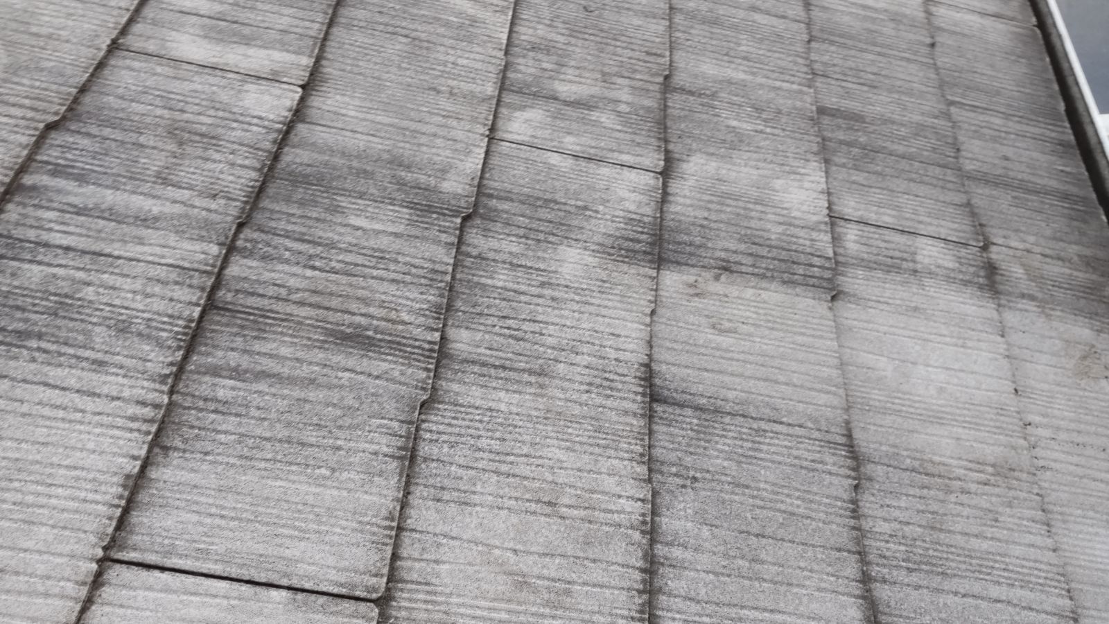 実際に現地で屋根を確認すると、表面の塗膜は広範囲で劣化が進んでおり、色褪せ・白化現象が顕著に見られました。また、屋根材自体が乾燥し割れやすくなっている兆候も複数箇所で確認でき、早急なメンテナンスが必要と判断いたしました。調査後には、お客様に現在の状態を写真付きでご説明し、屋根塗装による防水性・耐久性の向上についてお話しさせていただきました。