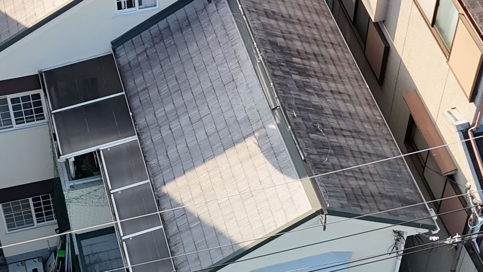 大阪府高槻市萩之庄にて実施した屋根塗装前の現地調査では、築20年のスレート屋根における広範囲の劣化・色褪せ・チョーキング現象が確認されました。特に紫外線が強く当たる南面の塗膜劣化が著しく、棟板金の浮きや隙間も発生しており、早期対応が必要な状況でした。