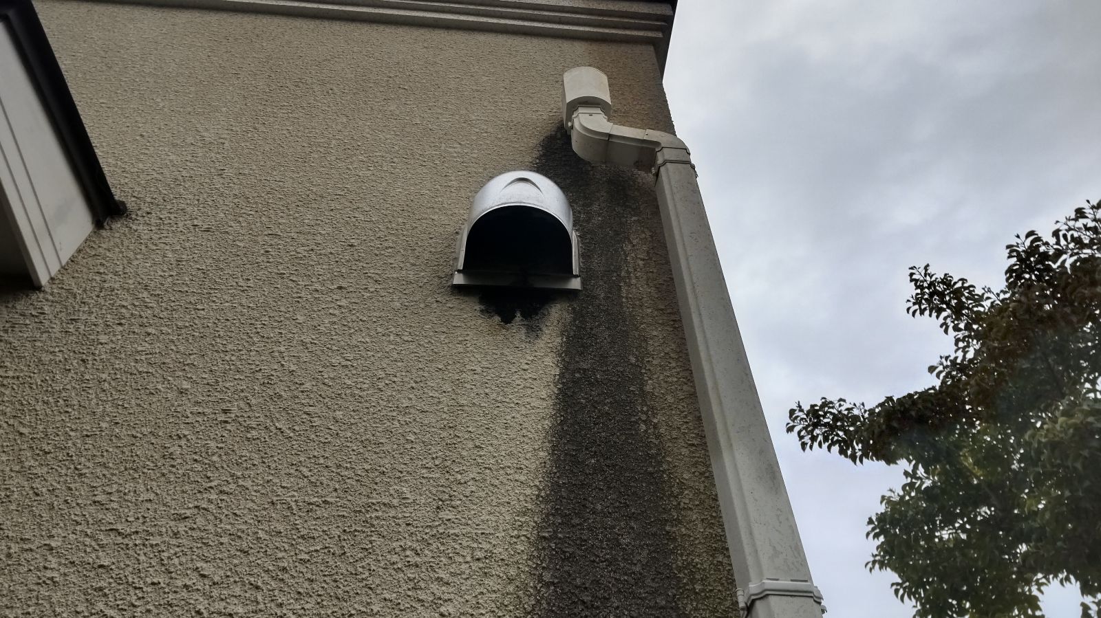 また、北側の外壁に発生していた雨だれ汚れは、換気フード下に黒ずみが垂れたように付着しており、美観の面で大きなマイナスポイントになっています。これは経年による換気扇内部の油分やホコリが排気とともに流れ出し、雨水と混じって外壁を汚してしまうため、日頃の掃除では対応しきれません。塗装によって再付着を防ぐ「防汚性」の高い塗料を選定することが今後の汚れ防止に繋がります。