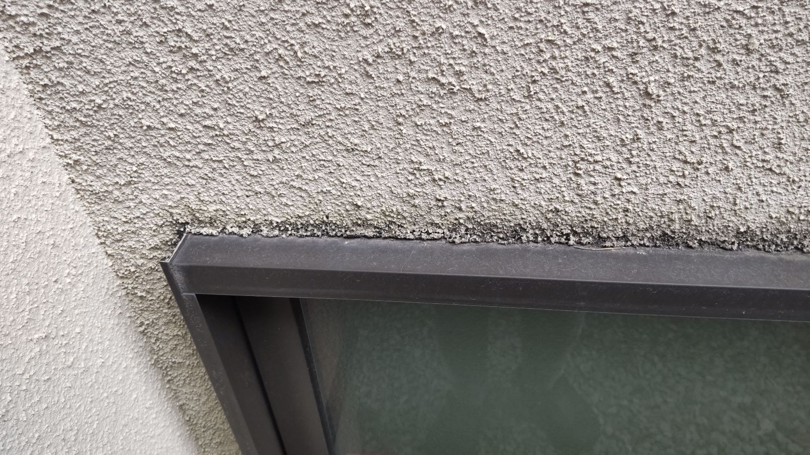まずは外壁全体を目視確認し、チョーキング現象の有無をチェック。触れると手に白い粉が付く状態で、塗膜の劣化が進行していることがわかりました。また、北側の外壁には換気フードからの黒い汚れ(雨だれ汚染)が目立ち、外観の印象にも影響を及ぼしている状況でした。