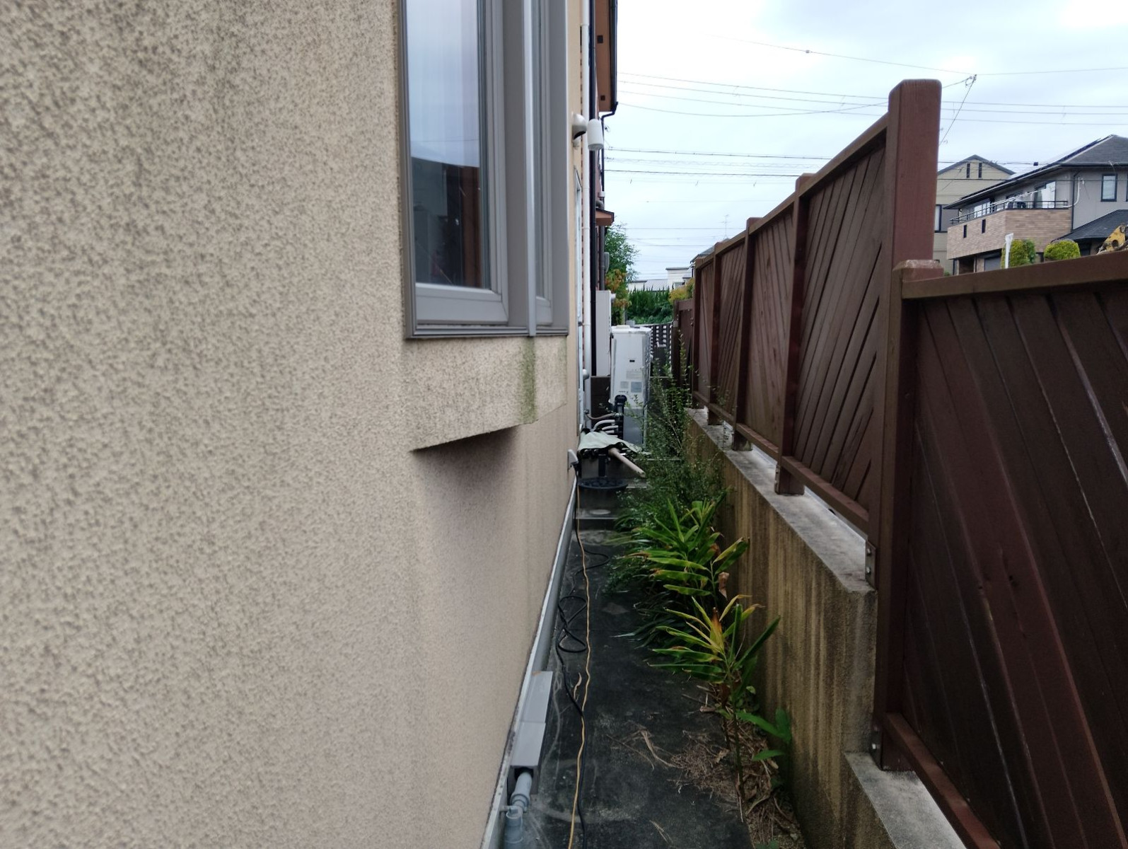 今回のお宅は、敷地と隣家との間が非常に狭く、外壁とフェンスの間隔は60cm程度といったところでした。こうした狭小スペースで足場を組むには、単管足場などのスリムタイプを活用し、確実な安全性を確保する必要があります。また、作業時には隣家への配慮を徹底しなければなりません。