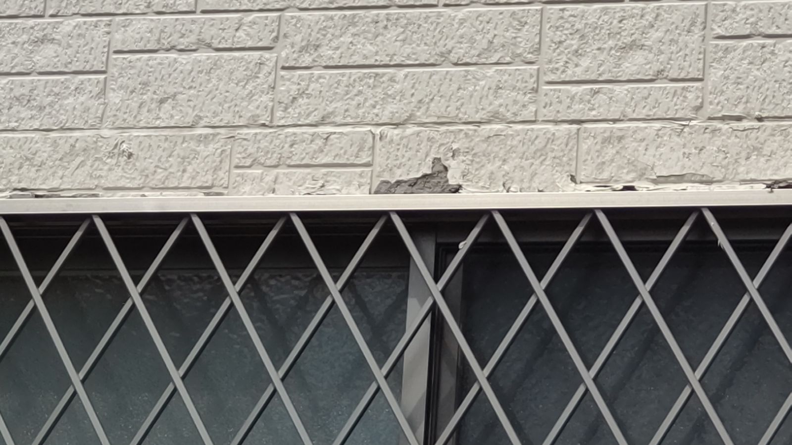 調査を進めると、まず窓まわりのサイディングに複数の浮き・剥がれが見受けられました。特に南面の窓上部では塗膜の剥離が進行しており、雨水の浸入が懸念される状態。さらに建物の角部分には打撃によると思われる欠けがあり、モルタル補修が必要と判断しました。