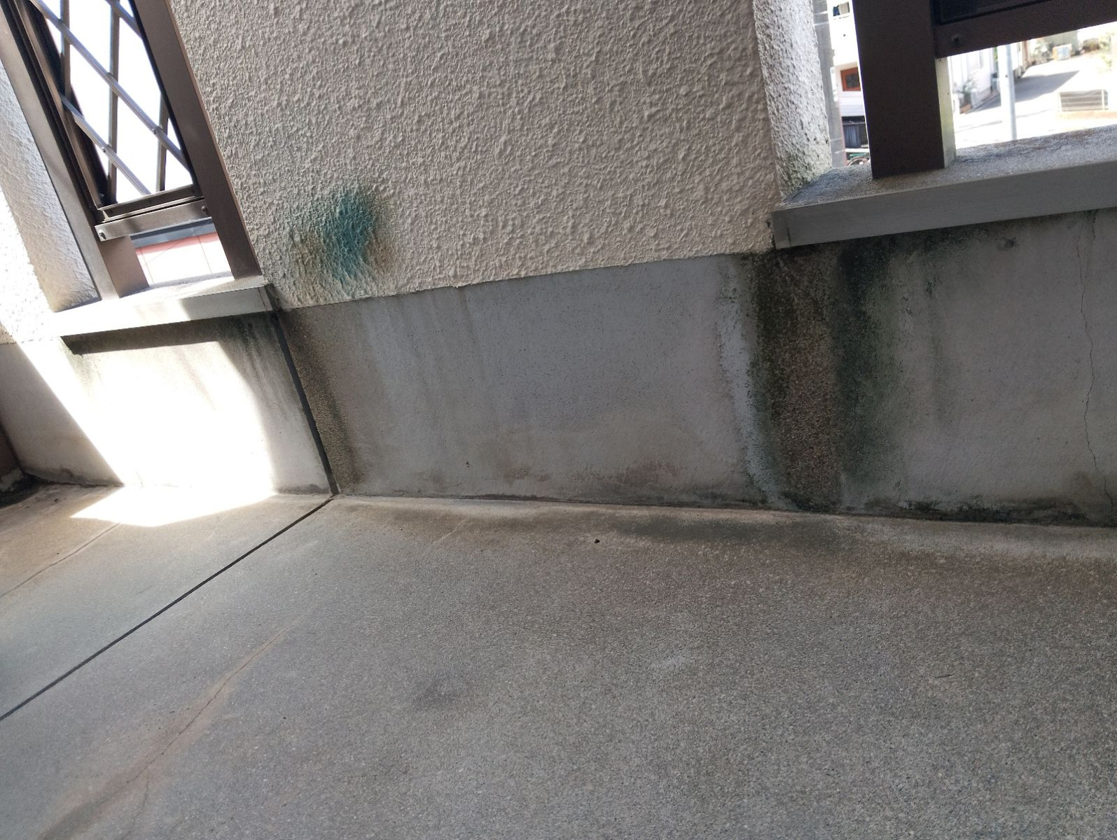 今回の現地調査では、外壁以外にもベランダまわりの劣化が気になるポイントとなりました。ベランダの床や壁際には雨染みや緑色のカビ汚れが点在しており、防水層の劣化が疑われる状況です。