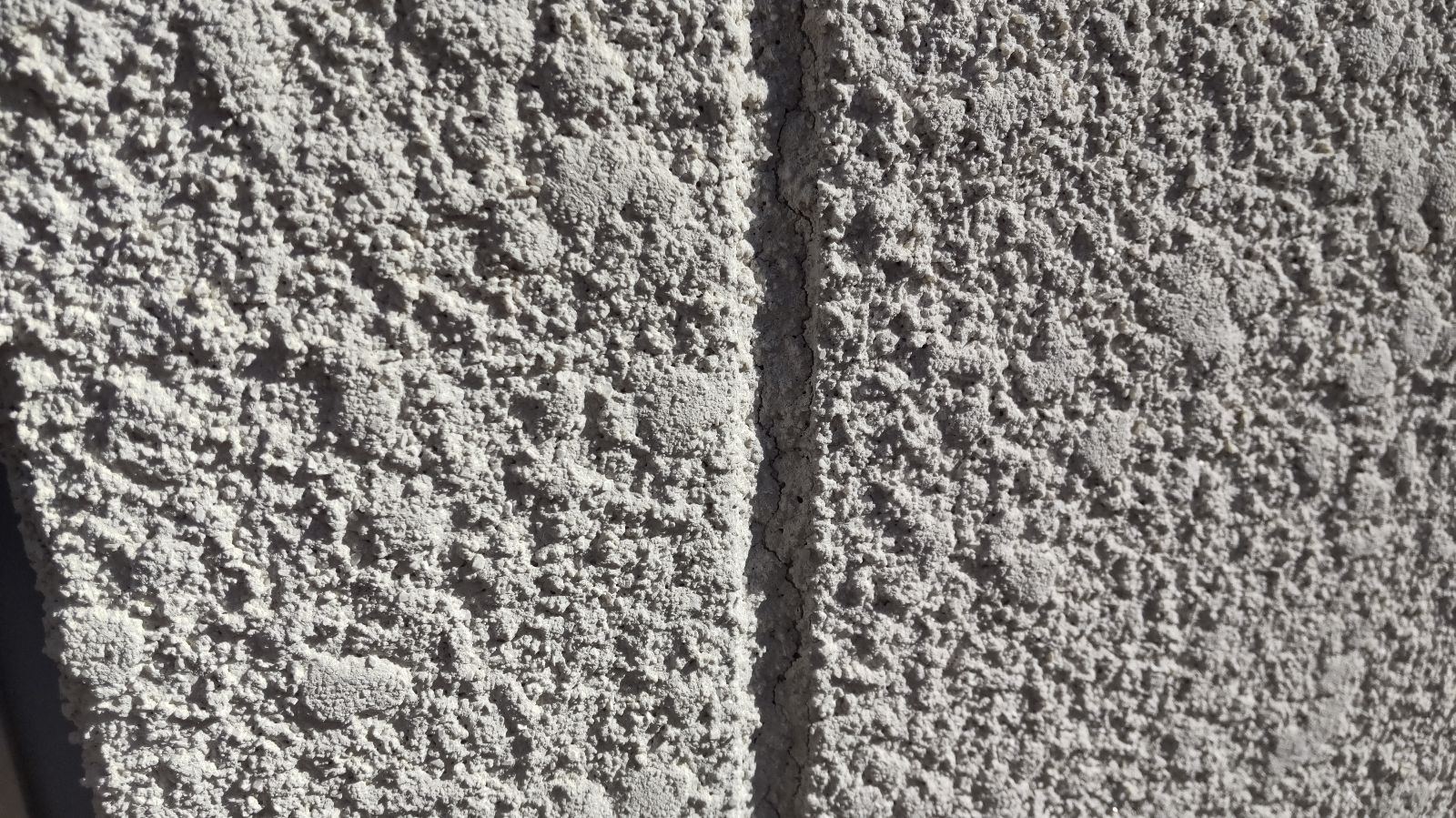 今回の現調でまず顕著だったのが、外壁の劣化状況です。特に目立ったのがチョーキング現象で、外壁全体が白くくすんだような印象を受けました。これは塗膜の樹脂が分解されて粉状になり、表面に浮き出てくるもので、塗り替えのサインとも言える重要な劣化症状です。