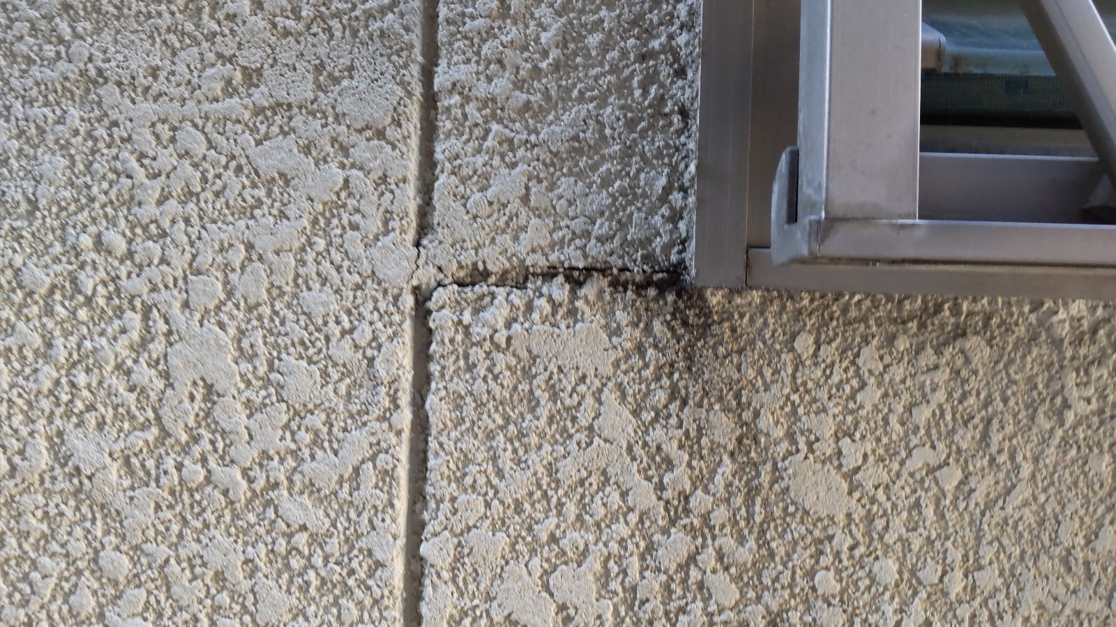 まず目に入ったのは、外壁表面の退色と汚れの付着。とくに日当たりの良い南面は紫外線による色あせが顕著で、チョーキング現象も確認されました(指で壁を擦ると白い粉がつく状態)。さらに、窓枠付近ではシーリング材の劣化が進行しており、一部には破断も見受けられました。