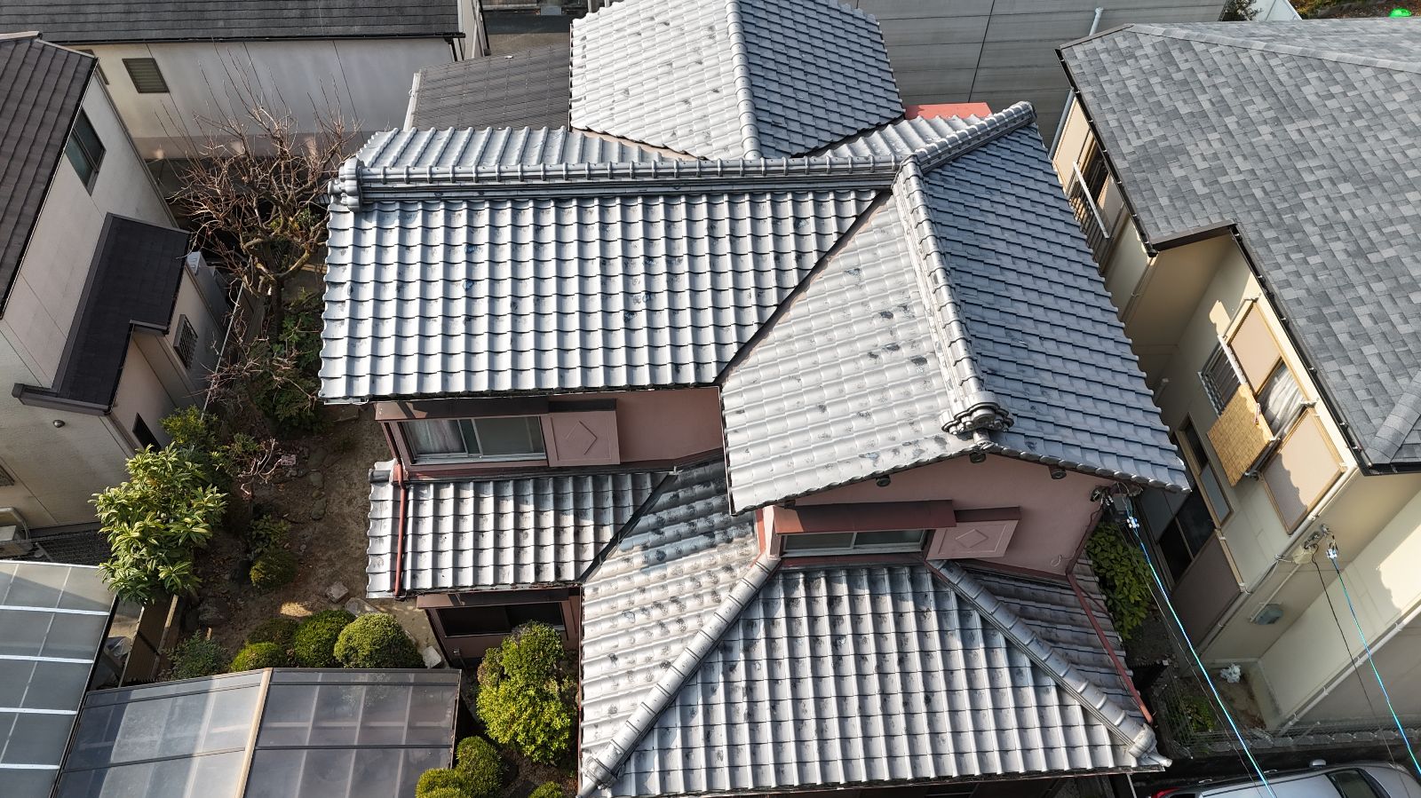 高槻市奥天神町エリアは、周辺が自然に囲まれていることもあり、古くから瓦屋根の住宅が数多く建ち並んでいます。今回のご自宅も例外ではなく、寄棟屋根をベースとした複雑な屋根構造で、谷や隅棟が多いのが特徴です。このような構造は、和の趣を演出する一方で、雨水の流れが交錯するため、どうしても雨漏りリスクが高くなります。