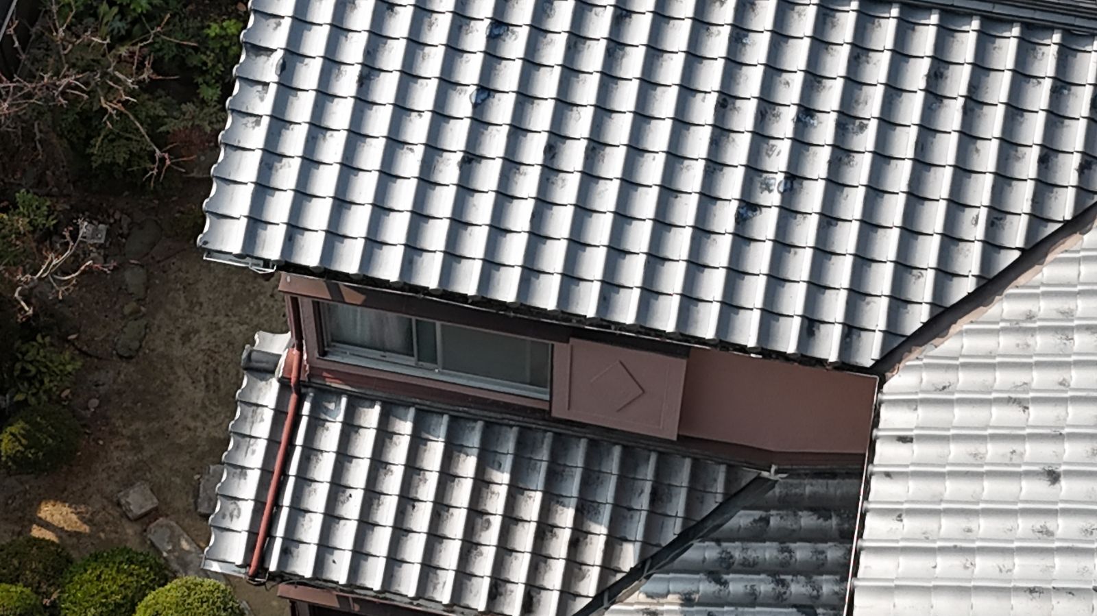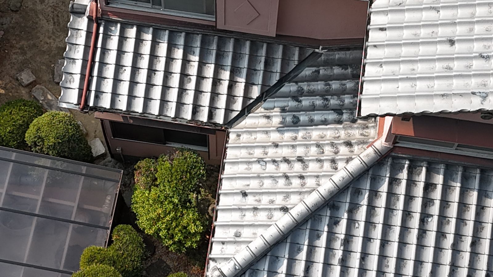 現地に到着し、まずは外観と屋根形状をドローンにて全体撮影。瓦のズレ、表面の色褪せ、苔の付着、雨樋の変形などを確認しました。特に谷部分の瓦に大きな隙間が見られ、強風時に雨水が逆流する恐れがありました。ドローンでの空撮は屋根の形状が複雑なこのようなケースでも、的確に劣化箇所を把握できるため、大変有効です。