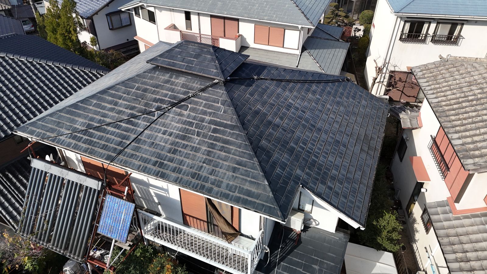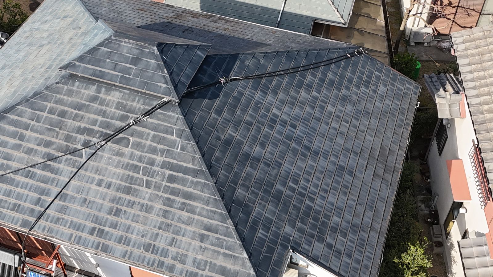 今回の芝谷町での現場は、立地条件や屋根の形状から、いくつかの注意点が浮かび上がってきました。まず、屋根は「寄棟(よせむね)」と呼ばれる4方向に傾斜を持つ形状であり、雨水が一か所に集中しにくい反面、棟板金の交差部や谷樋部分に水が溜まりやすいという弱点があります。