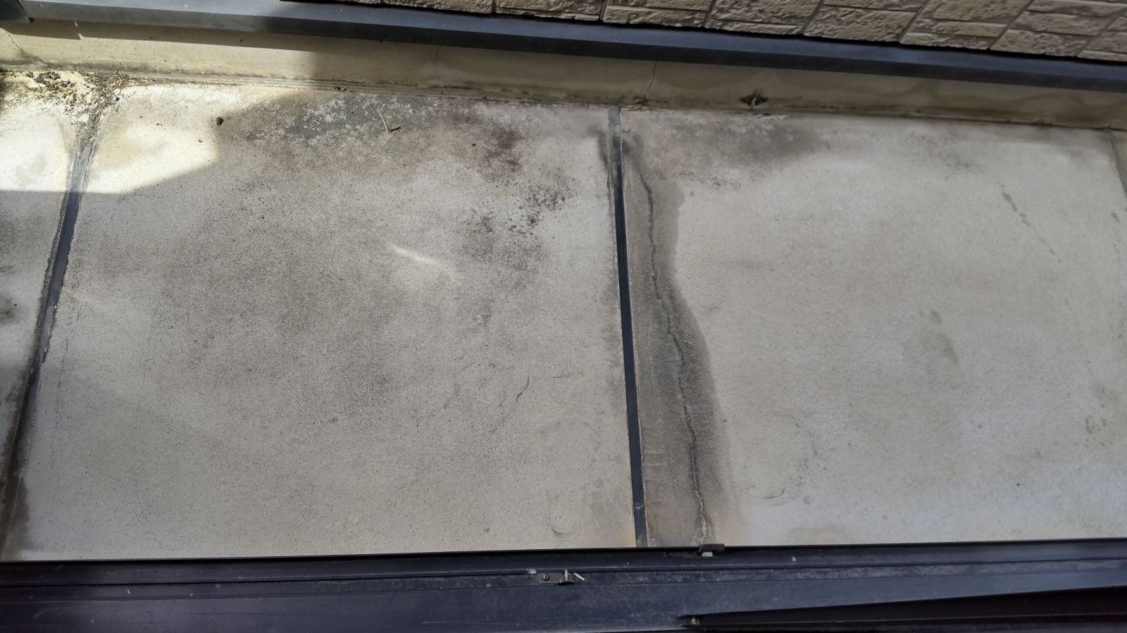 また、ベランダの床面にも黒ずみやひびが確認できました。日常的な使用による摩耗や排水の問題もありそうで、防水層の塗り替えが必要な状態です。建物全体としては構造的な大きな損傷は見られませんが、外装のメンテナンス時期としては適正タイミングと言える状況でした。